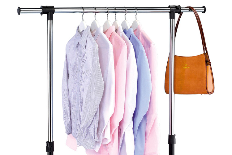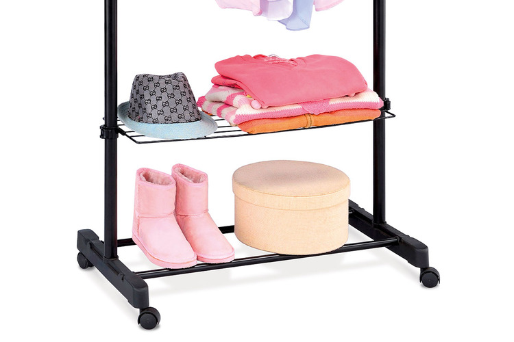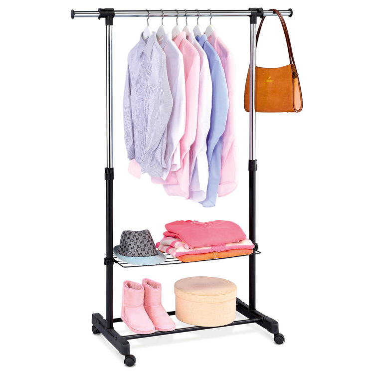 Stojan na šaty, jednoramenný, s pojazdom bez aretácie v prevedení chróm/čierna farba kovu a plastu a praktickým odkladačom tvoreným dvoma kovovými spojovacími rúrkami a drôtenou odkladacou poličkou, ktorú si môžete ľubovoľne nastaviť podľa aktuálnej potreby. Odporúčaná nosnosť je 5 kg rovnomerne rozloženej záťaže na jedno rameno a 2 kg na poličku. Horné rameno je na oboch koncoch opatrené teleskopickými rektifikovateľnými koncovkami a môžete ho vysunúť až do úžasnej celkovej šírky 133 cm. Stojan je určený do domácností a nie je určený na záťažovú prevádzku. Výškovo nastaviteľný. Dodávané v demontovanom stave.