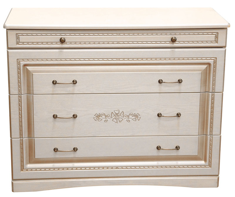 Nábytok do spálne predstavuje štýlovú kolekciu nábytku, ktorá umožní komfortné vybavenie spálne. Vysoká funkčnosť jednotlivých súčastí a atraktívny dizajn sú zárukou zákazníkovej spokojnosti. Jednotlivé prvky tejto kolekcie sa môžu pochváliť vysokou kvalitou prevedenia, precíznym spracovaním av neposlednom rade neobvyklým dizajnom s ozdobným frézovaním dvierok. Komoda so šuplíkmi štýlu, pre ktorý je charakteristické ozdobné prevedenie, prírodné materiály a vyvážené dekoratívne prvky. Ponúka bohatý úložný priestor v podobe 4 zásuviek.