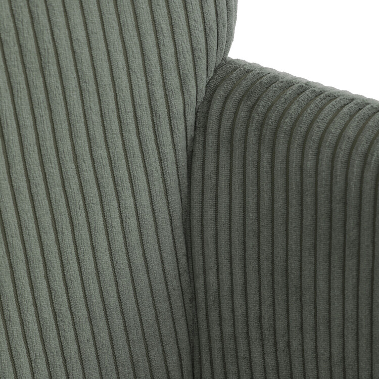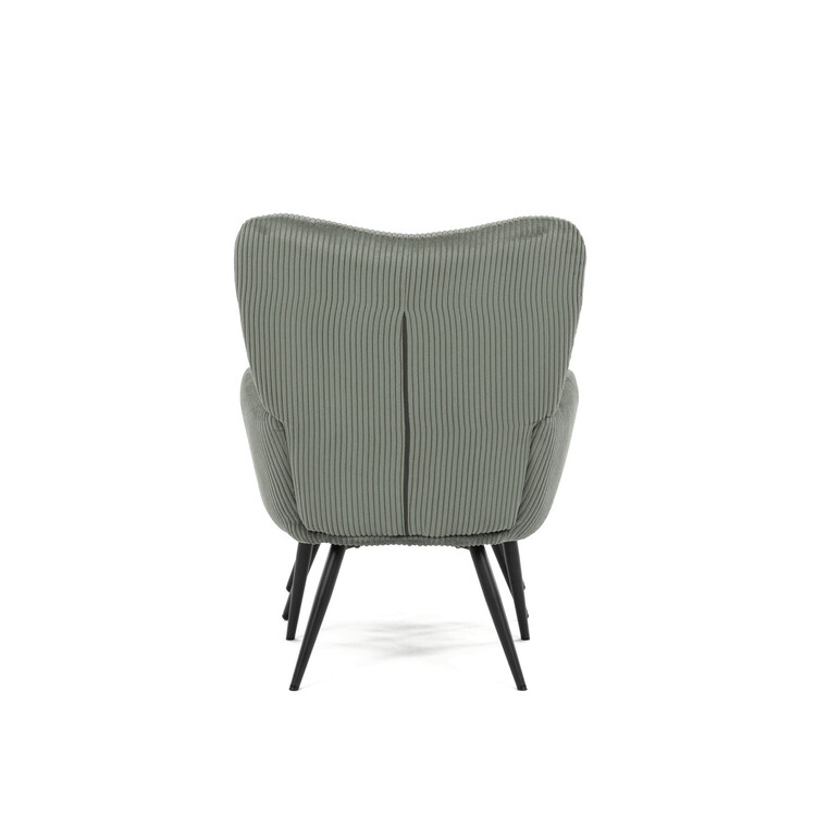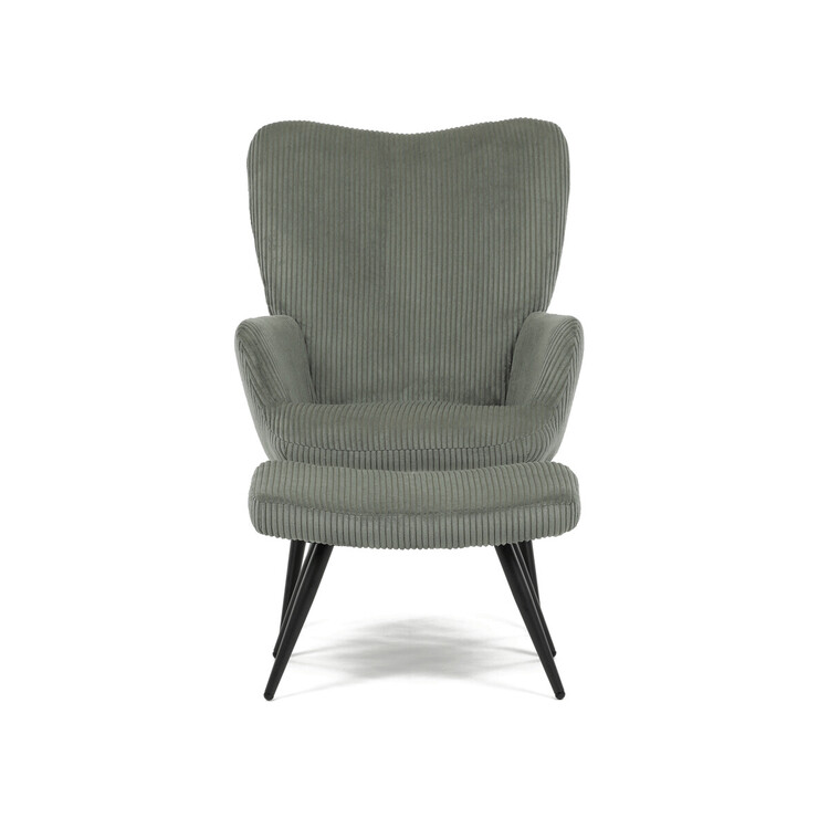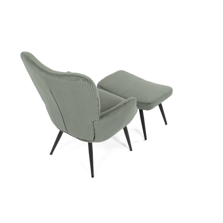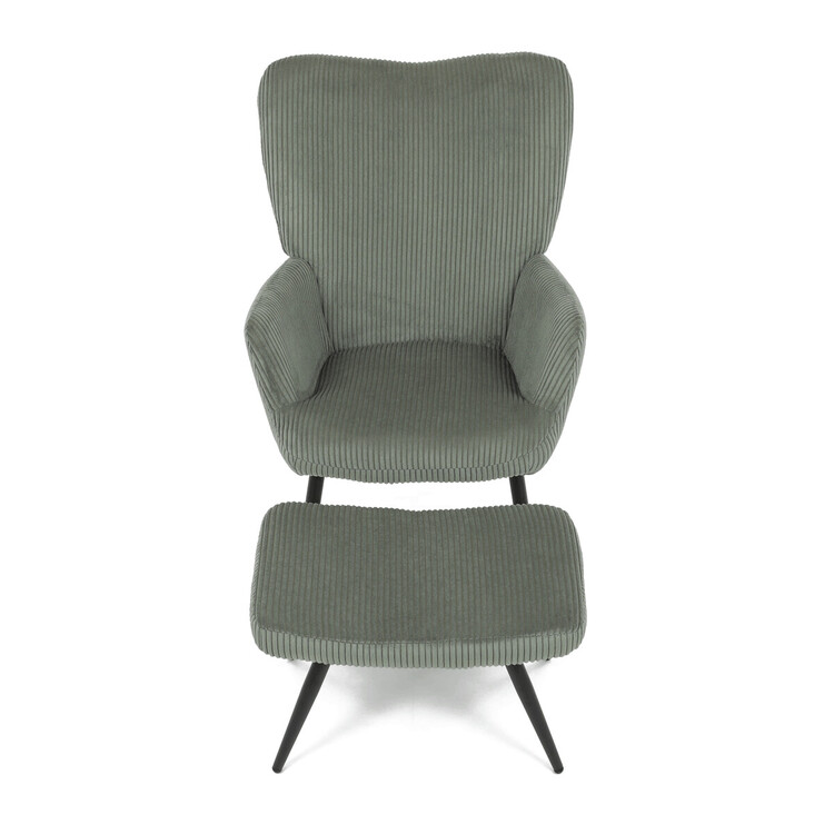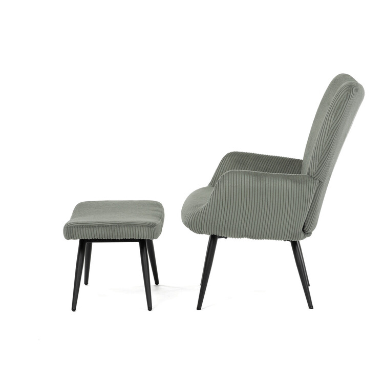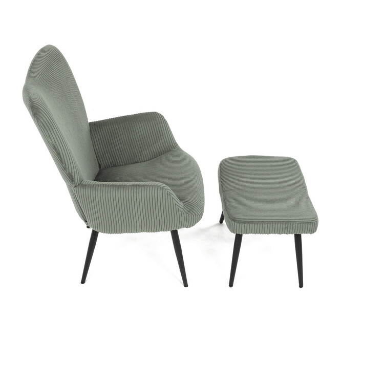 Relaxačné kreslo s podnožkou v zelenom menčestri ponúka pohodlné posedenie s mäkkým, príjemným poťahom, ktorý zdôrazňuje štruktúru menčestra. Pevné čierne kovové nohy zaisťujú stabilitu a dlhú životnosť, zatiaľ čo integrované podrúčky prispievajú k pohodliu pri odpočinku. Kreslo nie je otočné ani rozkladacie, ale vďaka pridanému taburetu umožňuje pohodlné opretie nôh a relaxáciu. Dizajn kombinuje klasický tvar s moderným materiálom, čo ho robí vhodným doplnkom do obývacích izieb aj relaxačných zón. Celková konštrukcia je navrhnutá tak, aby poskytovala komfortné sedenie s dôrazom na pevnosť a stabilitu.