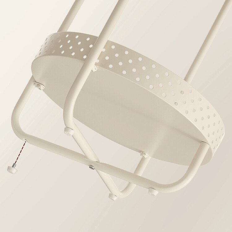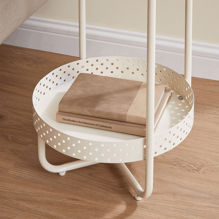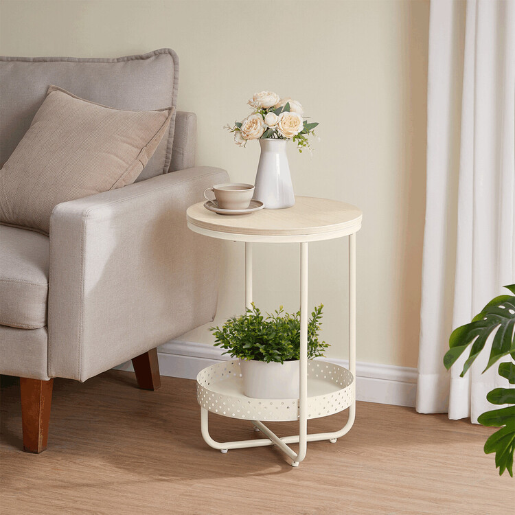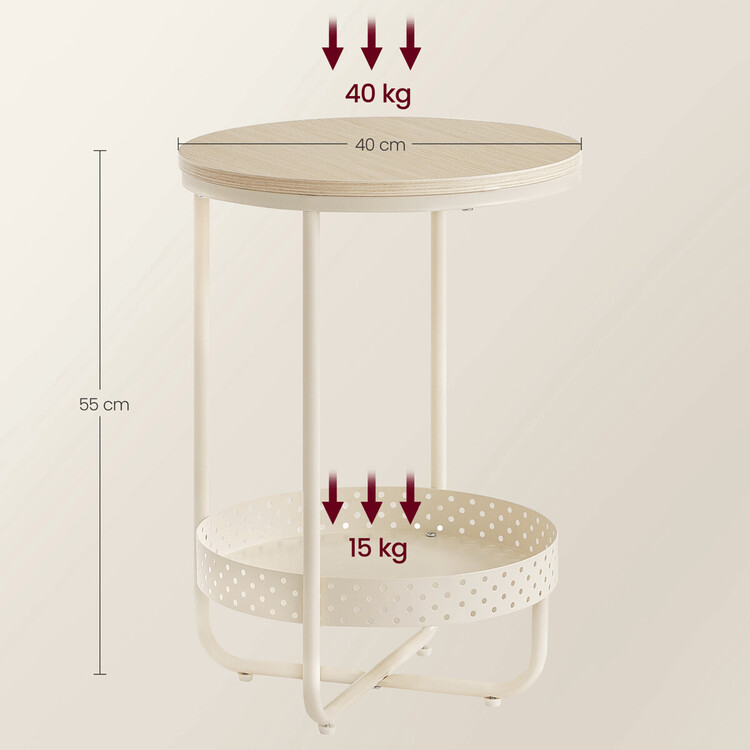 Odkladací stolík s rozmermi 40×40×55 cm kombinuje dosku z MDF s dekórom bieleného duba a matnou povrchovou úpravou s pevnou kovovou konštrukciou v béžovom odtieni. Okrúhla doska ponúka stabilnú plochu na odloženie drobných predmetov, zatiaľ čo spodný odkladací priestor s perforovaným kovovým okrajom poskytuje praktické miesto na ďalšie uskladnenie. Kovové nohy sú vybavené rektifikačnými pätkami, ktoré umožňujú vyrovnanie stolíka na nerovnom povrchu a zaisťujú stabilitu. Celkový design je jednoduchý a funkčný, vhodný do moderných aj klasických interiérov.