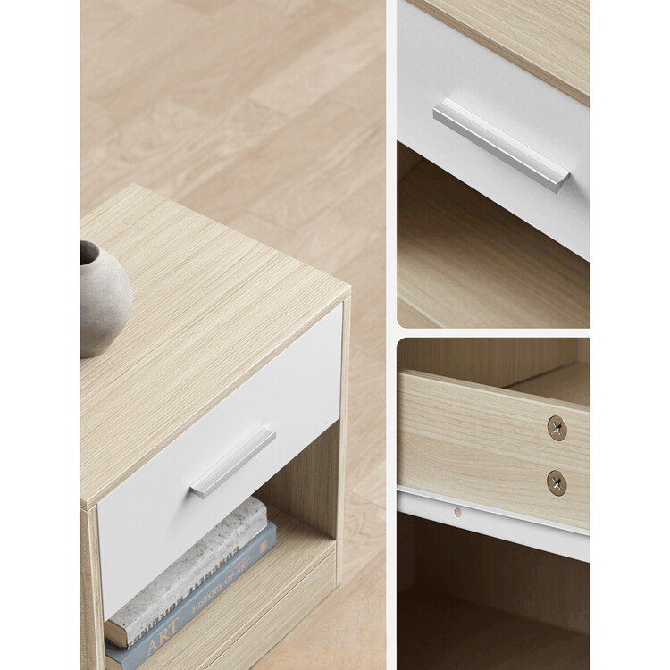 Súprava dvoch nočných stolíkov v prírodnej béžovej farbe s bielymi čelami zásuviek ponúka praktické riešenie pre usporiadanie priestoru vedľa postele. Vyrobené sú z MDF s matnou povrchovou úpravou v dekore bieleného duba, ktorá zaisťuje jednoduchú údržbu a odolnosť proti bežnému opotrebovaniu. Každý stolík disponuje jednou zásuvkou s jednoduchou úchytkou a otvoreným úložným priestorom pod ňou, ideálnym na uloženie kníh alebo drobných predmetov. Kompaktné rozmery 39 × 27,6 × 41 cm umožňujú ľahké umiestnenie aj do menších priestorov. Stabilné prevedenie MDF materiálu zaručuje dlhú životnosť a pevnosť stolíka.