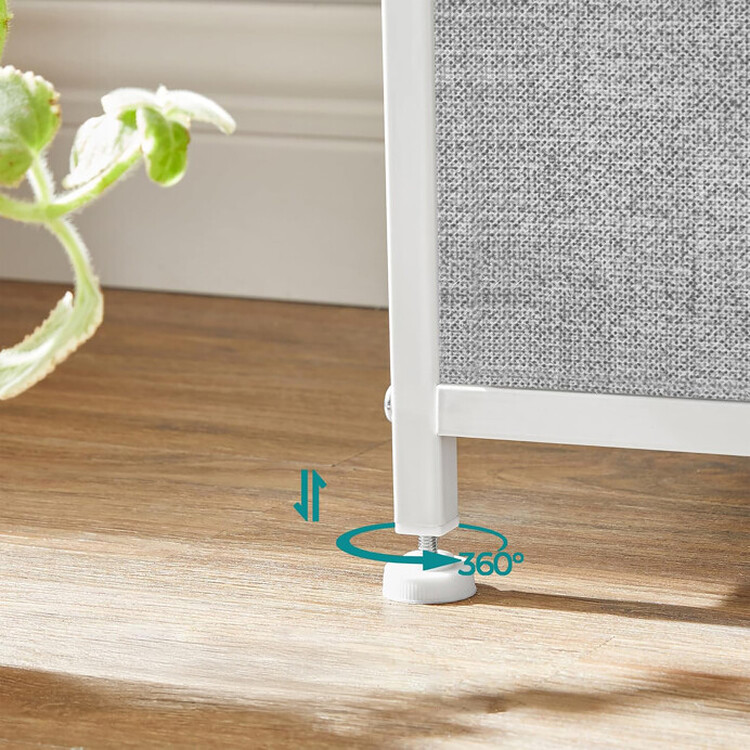 Komoda s rozmermi 80×30×82 cm kombinuje pevnú kovovú konštrukciu s doskou z MDF v matnom bielom prevedení, ktorá zaisťuje stabilitu a jednoduchú údržbu. Osem látkových zásuviek v šedej farbe ponúka praktický úložný priestor pre rôzne drobnosti a textilný materiál zásuviek prispieva k ľahkému a vzdušnému vzhľadu. Kovové nohy sú vybavené plastovými krytkami, ktoré chránia podlahu pred poškodením. Komoda je vhodná do moderných aj minimalistických interiérov, kde oceníte kombináciu funkčnosti a jednoduchého designu.
