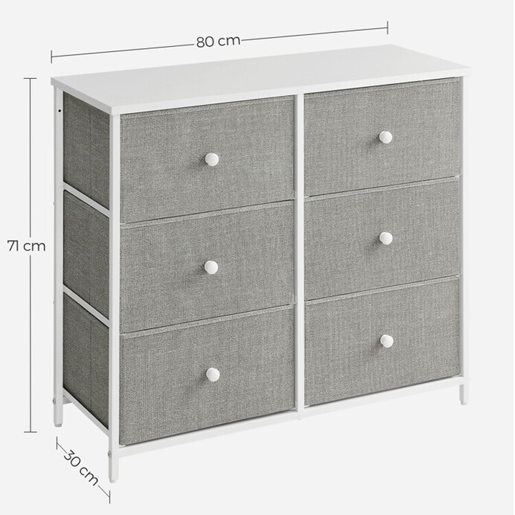 Komoda so šedými látkovými zásuvkami ponúka praktické riešenie úložného priestoru v modernom prevedení. Jej pevná konštrukcia kombinuje biely oceľový rám s odolnou doskou z MDF, ktorá zaisťuje stabilitu a dlhú životnosť. Šesť zásuviek z netkanej textílie poskytuje ľahký prístup k uloženým veciam a zároveň prispieva k vzdušnému vzhľadu komody. Komoda je vhodná do rôznych interiérov, kde oceníte kombináciu funkčnosti a jednoduchého designu. Rozmery 80×30×71 cm umožňujú umiestnenie aj do menších priestorov.