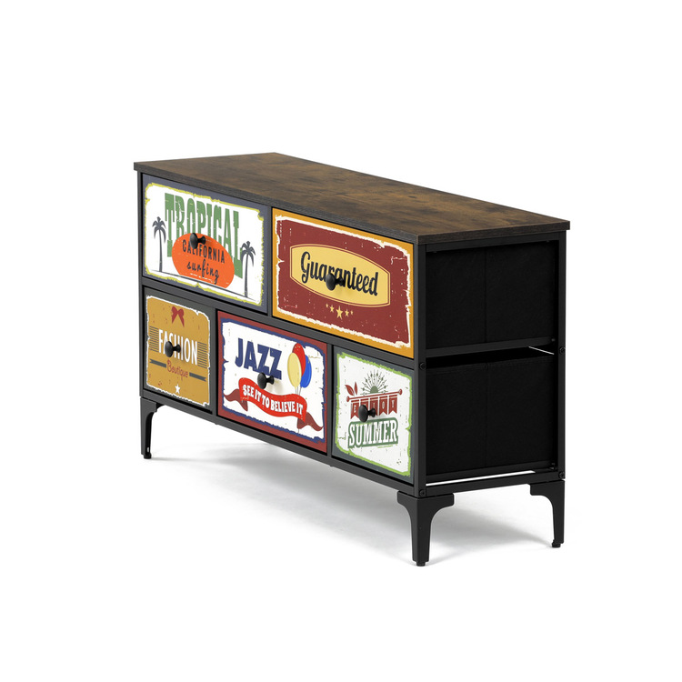 Retro komoda značky Autronic prinesie do vášho interiéru jedinečný štýl a originalitu. Textilné čelá zásuviek s výplňou HDF a vintage potlačou navodzujú atmosféru starých amerických barov a jazzových klubov. Kombinácia čiernej kovovej konštrukcie, dosky v dekore starého dreva a ozdobných nôh dodáva nábytku robustný, ale zároveň elegantný vzhľad. Korpus zásuviek je vyrobený z netkanej textílie s výplňou HDF, čo zaisťuje ich ľahkosť a jednoduchú manipuláciu. Ideálny doplnok do obývacej izby alebo štýlovej kaviarne, kde sa stane neprehliadnuteľným prvkom.