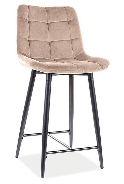 Atraktívna čalúnená polo barová stolička. Kovová konštrukcia je lakovaná čiernou farbou, čalúnenie je z látky Bluvel aksamit v béžovej farbe. Celková výška stoličky je 92 cm, výška sedadla je 60 cm. Dodávame v demontovanom stave.CASA 11395