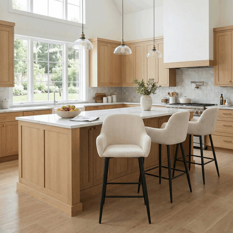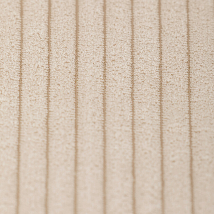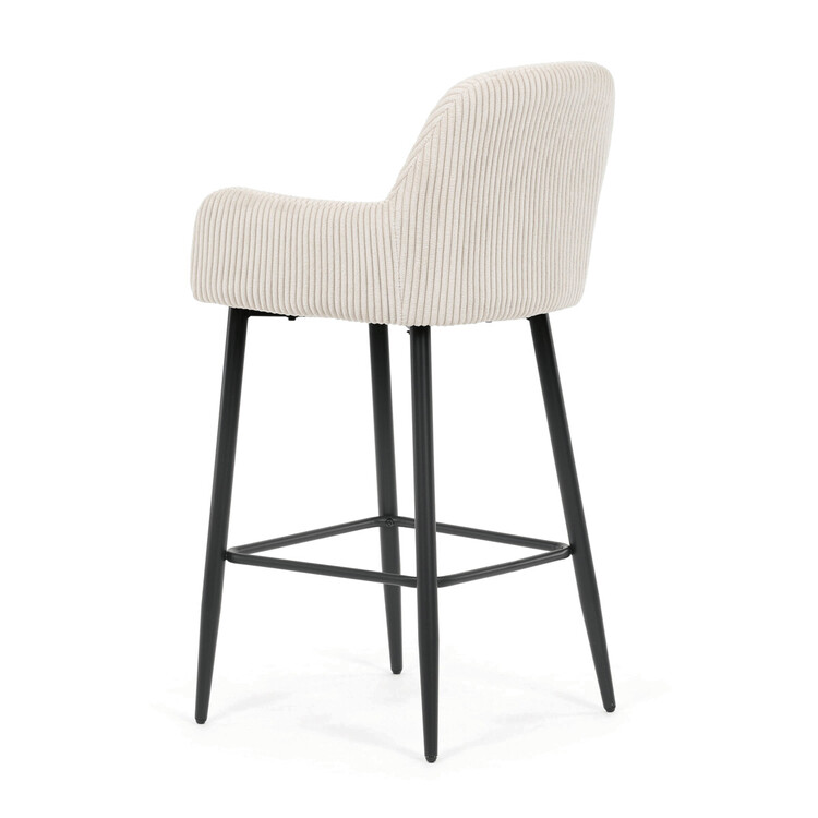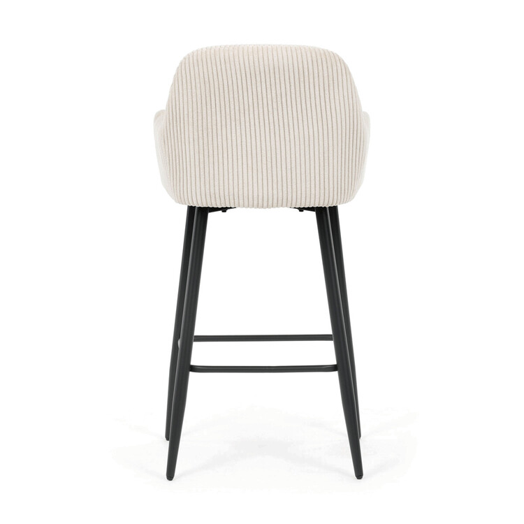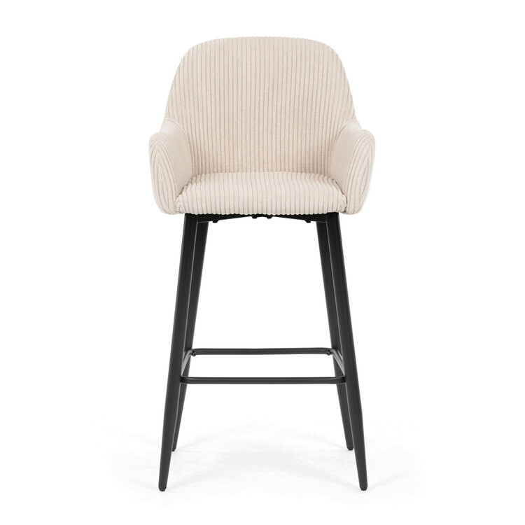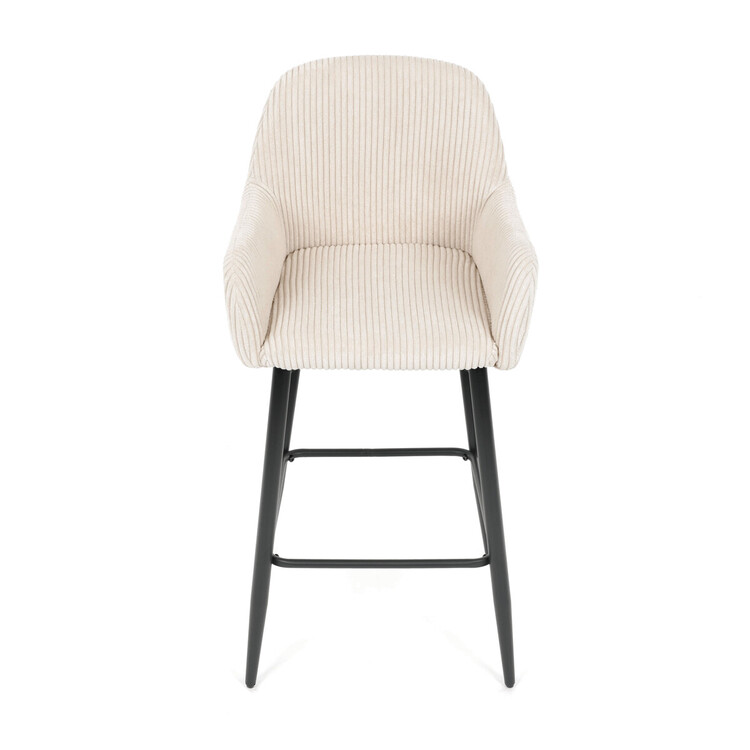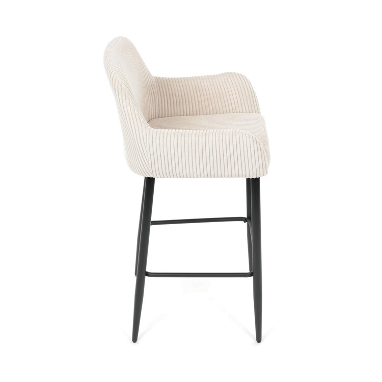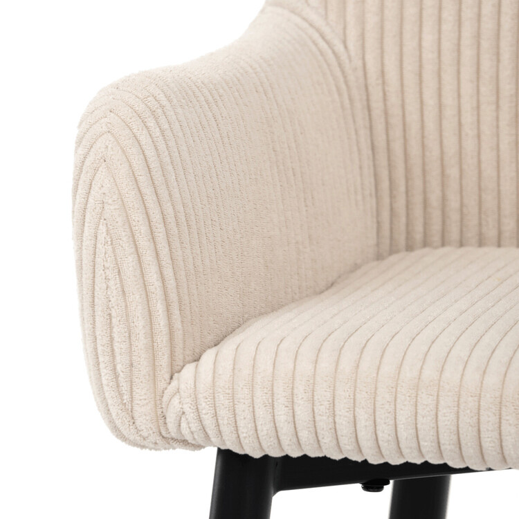 Barová stolička s podrúčkami v béžovom menčestrovom poťahu kombinuje pohodlie a moderný dizajn. Sedák aj operadlo sú čalúnené príjemnou menčestrovou látkou, ktorá ponúka mäkký povrch s jemnou textúrou a jednoduchú údržbu. Pevné kovové nohy v čiernom matnom prevedení zaisťujú stabilitu a dlhú životnosť, pričom spodná priečna výstuha slúži zároveň ako praktická opierka nôh. Stolička nie je otočná, čo podčiarkuje jej jednoduchý a elegantný tvar vhodný pre bary, kuchynské ostrovčeky či vysoké stoly. Vďaka ergonomicky tvarovaným podrúčkam poskytuje dostatočnú oporu pre ruky a prispieva k pohodlnému posedeniu.