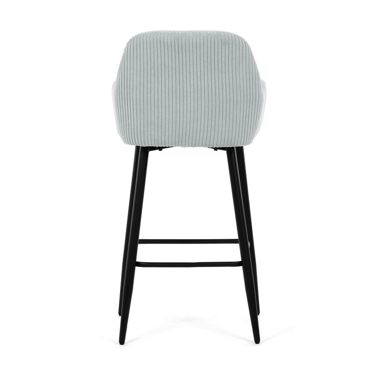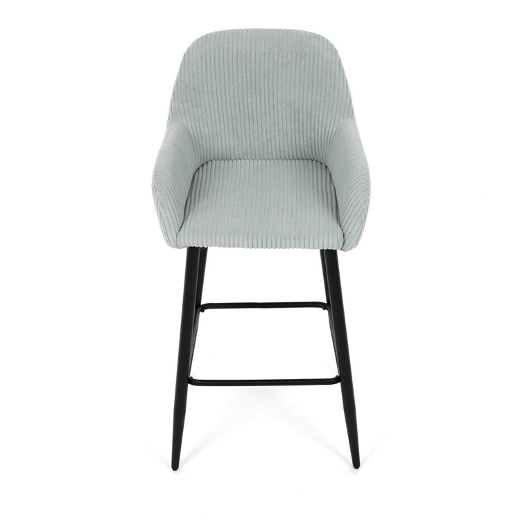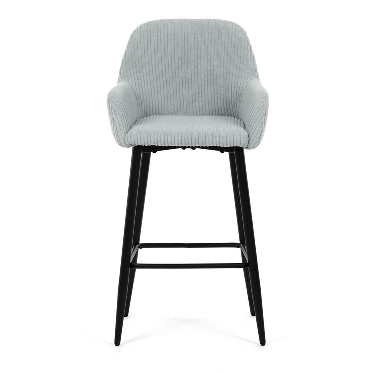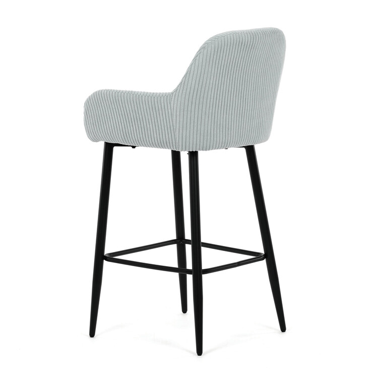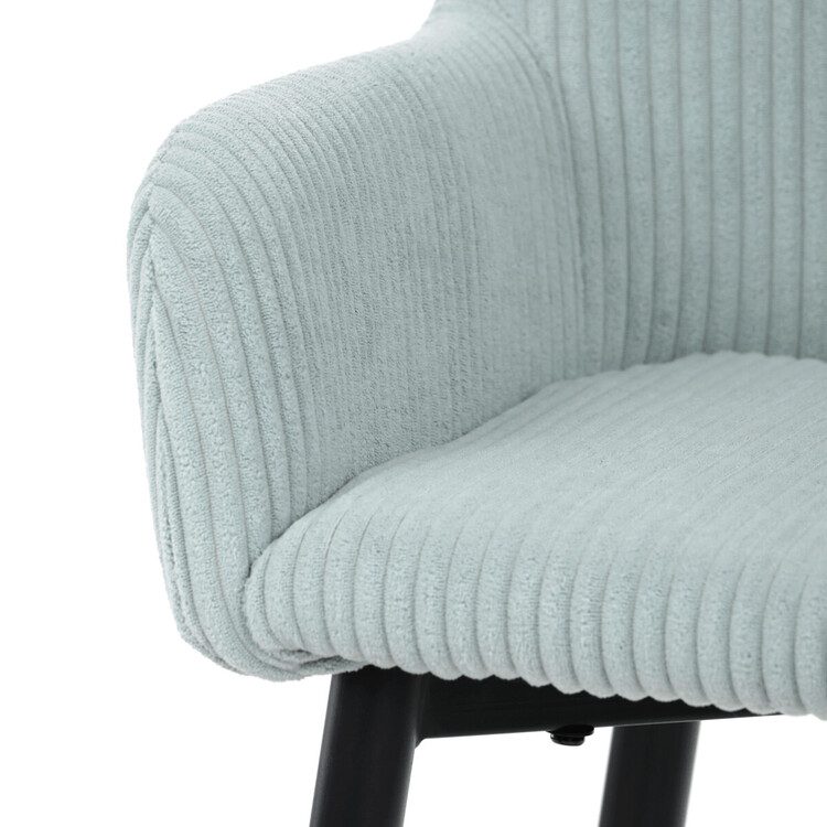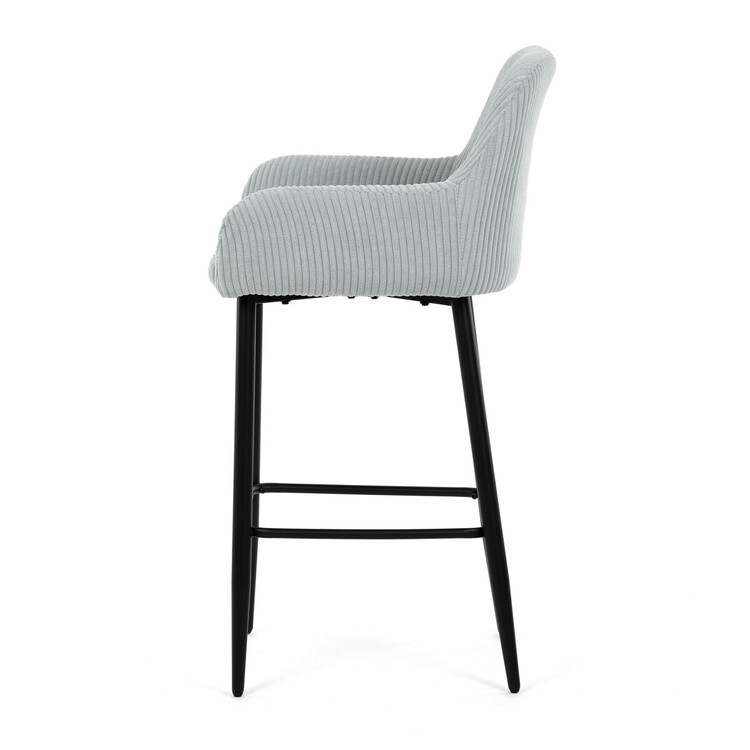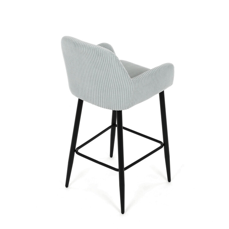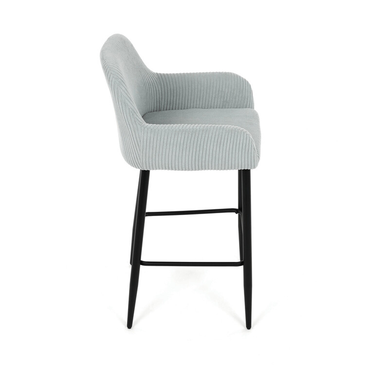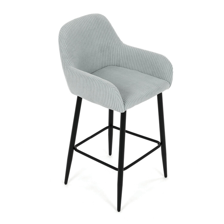 Barová stolička s podrúčkami v modrom menčestrovom poťahu ponúka pohodlné posedenie s príjemnou textúrou látky, ktorá je navrhnutá pre dlhú životnosť a jednoduchú údržbu. Pevné čierne kovové nohy zaisťujú stabilitu a odolnosť, pričom ich konštrukcia obsahuje aj praktickú opierku nôh na zvýšenie komfortu pri sedení. Ergonomicky tvarované operadlo a podrúčky poskytujú dostatočnú oporu paží a chrbta, čo prispieva k pohodlnému posedeniu pri barovom pulte alebo kuchynskom ostrovčeku. Stolička nie je otočná, čo podčiarkuje jej jednoduchý a stabilný dizajn vhodný do moderných aj klasických interiérov. Nosnosť a rozmery sú prispôsobené bežným požiadavkám na barové sedenie.