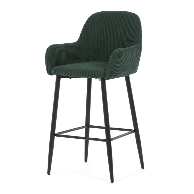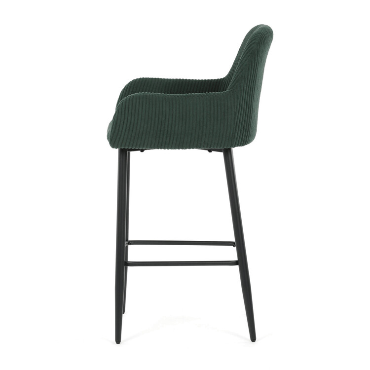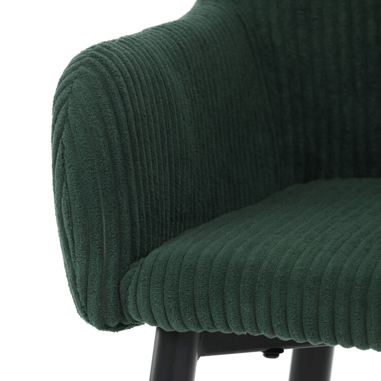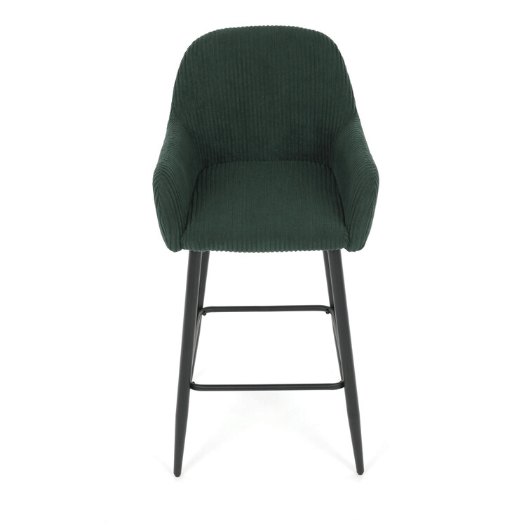 Barová stolička s podrúčkami v zelenom menčestrovom poťahu ponúka pohodlné posedenie s príjemnou textúrou látky, ktorá je navrhnutá pre dlhú životnosť a jednoduchú údržbu. Pevná kovová podnož v čiernom matnom prevedení zaisťuje stabilitu a odolnosť pri každodennom používaní. Ergonomicky tvarované operadlo a integrované podrúčky podporujú správnu polohu tela a prispievajú k vyššiemu komfortu počas sedenia. Stolička nie je otočná, čo podčiarkuje jej pevnú a stabilnú konštrukciu vhodnú pre barové pulty či vysoké stoly. Vďaka svojmu dizajnu a kvalitnému spracovaniu sa hodí do moderných interiérov aj komerčných priestorov.