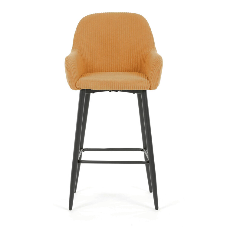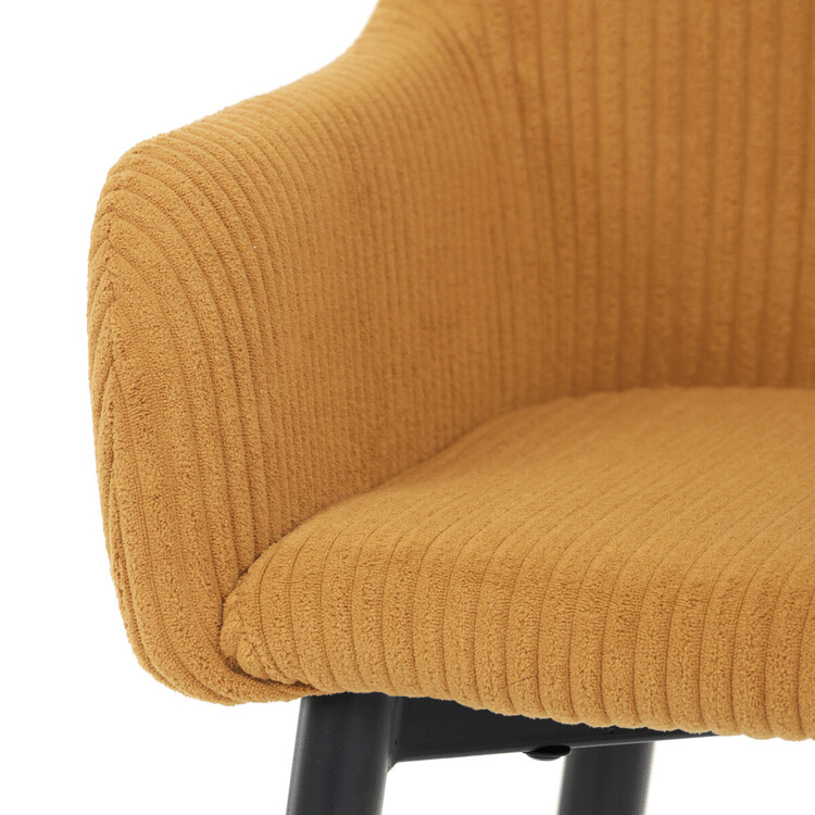 Barová stolička s podrúčkami vyniká poťahom z žltej menčestrovej látky, ktorá ponúka príjemnú textúru a jednoduchú údržbu. Pevná kovová podnož v čiernom prevedení zaisťuje stabilitu a dlhú životnosť. Ergonomicky tvarované operadlo a integrované podrúčky poskytujú komfortnú oporu pri sedení pri barovom pulte či vysokom stole. Stolička nie je otočná, čo prispieva k jej pevnosti a jednoduchému designu. Je vhodná pre komerčné aj domáce prostredie, kde je kladený dôraz na štýl aj funkčnosť.