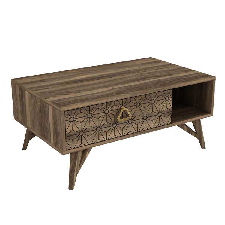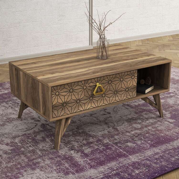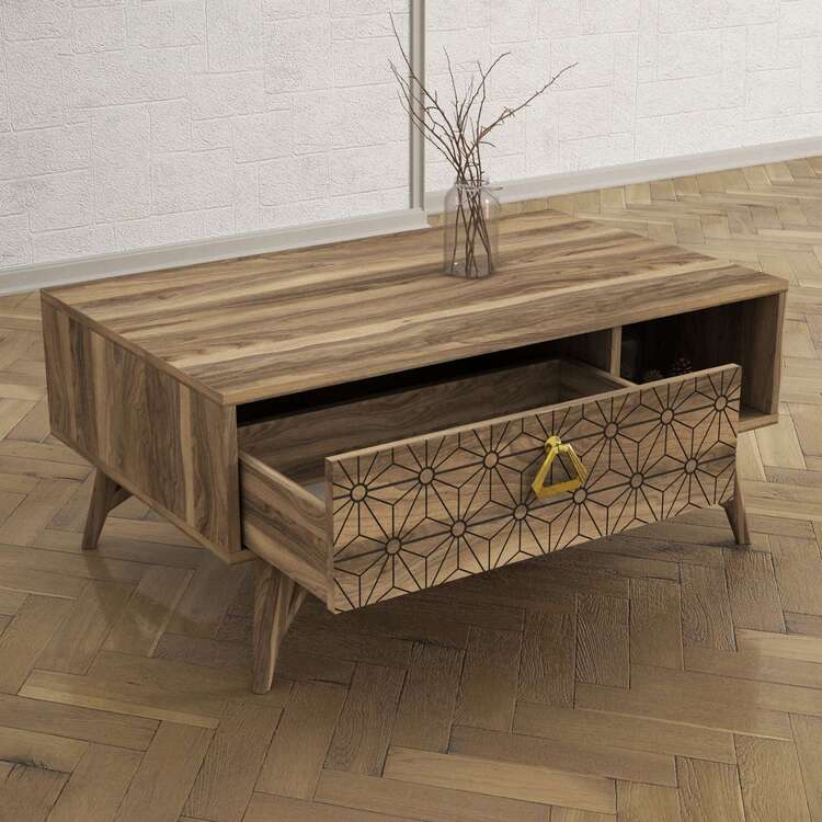 Stolík ponúka priestrannú plochu pre vaše kávové šálky, knihy alebo dekorácie. Vďaka jednej zásuvke a odkladacej polici poskytuje dostatok úložného priestoru pre vaše potreby, čo udržuje vašu obývaciu izbu usporiadanú a elegantnú.