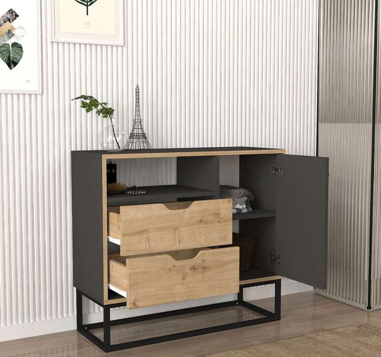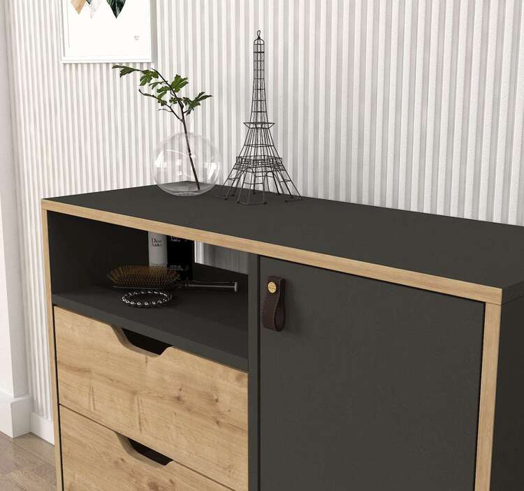 Komoda sa vyznačuje elegantným antracitovým prevedením kombinovaným so svetlo hnedými detailmi, ktoré dodávajú nábytku moderný a atraktívny vzhľad. S dvoma zásuvkami, skrinkou a regálkom ponúka dostatok úložného priestoru pre všetky vaše potreby. Kovové prvky dodávajú komode na odolnosti a štýle.