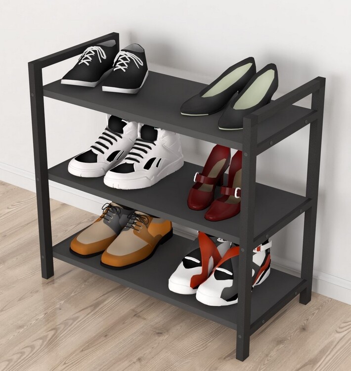 Botník s tromi policami je z kovového rámu v matnej čiernej farbe a police sú vyrobené z kvalitnej LTD dosky. Farbené prevedenie políc je antracit. Dodávame v demontovanom stave.CASA 36008
