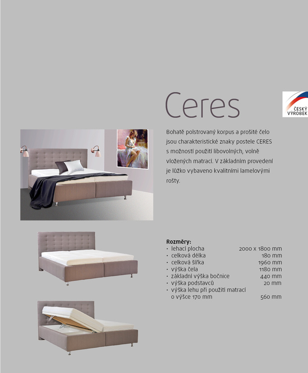 Bohato polstrovaný korpus a prešité čelo sú charakteristické znaky postele CERES. Posteľ je určená pre ľubovoľné, voľne vložené matrace. V základnom prevedení je lôžko vybavené kvalitnými rošty. Pre pohodlné užívanie úložného priestoru sú rošty vybavené šikovnými matracovými zarážkami. Výška nožičiek je 12 cm. Nôžky kovové.