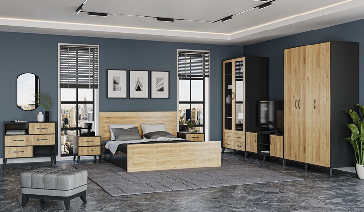 Komoda s tromi zásuvkami, korpus je vyrobený z LTD dosky odolné voči poškriabaniu vo farbe antracit, čelá zásuviek sú vyrobené z dosky MDF vo farbe dub wotan. Zásuvky sú vybavené teleskopickými výsuvmi. Úchyty a nôžky sú vo farbe antracit. Dodávame v demontovanom stave.CASA 19021