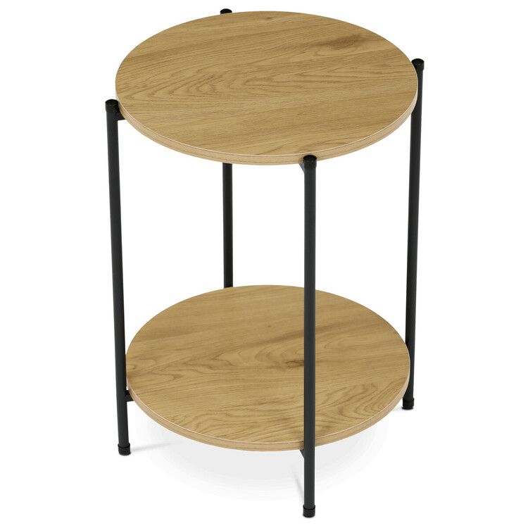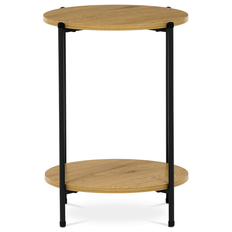 Moderný prístavný stolík značky Autronic spája minimalistický design a funkčnosť. Okrúhle dosky v dekore divokého duba dodávajú stolíku prírodnú eleganciu, zatiaľ čo čierno lakovaný kovový rám zaisťuje stabilitu a odolnosť. Dve praktické police ponúkajú dostatok priestoru na uloženie dekorácií, kníh alebo šálky kávy. Vďaka svojmu univerzálnemu vzhľadu je tento stolík ideálnou voľbou do obývacej izby, spálne alebo kancelárie. Vneste do svojho interiéru štýl a praktickosť s týmto nadčasovým kúskom!