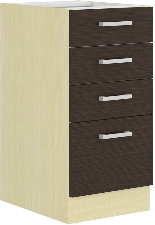 Dolné sk? Í? Ka so 4 zásuvkami CHAMONIX II vyrobená z kvalitného lamina. Korpus aj sokel (10 cm) sú vo farbe? dub ferrara a dvoje? ka vo farbe? dub tmavé legno. Rozm? Ry sk? Í? Ky - šíri? Ka 40 cm, výška 82 cm, hĺbka 52 cm (s pracovnou doskou zaberie 60 cm). Vzadu sa necháva voľný priestor. Pracovná doska nie je v cien ?. Úchyty sú z plastu. V našej ponuke nájdete ďalšie výber? R cz? Číne? Kk zostavenie celej kuchyn ?.