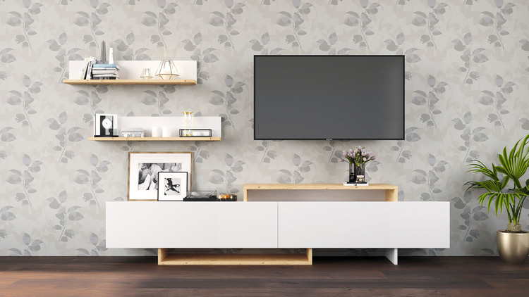 Obývacia stena je vyrobená z 16 mm laminovanej dosky, ktorá je známa svojou odolnosťou a dlhou životnosťou. Obývacia stena ponúka dostatok úložného priestoru v podobe otvorených políc a výklopných skriniek v TV stolíku.