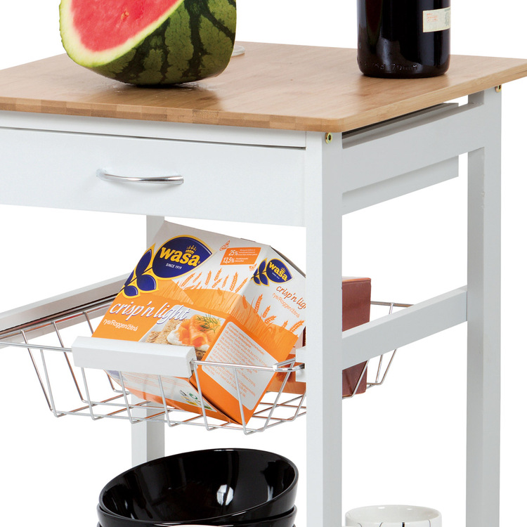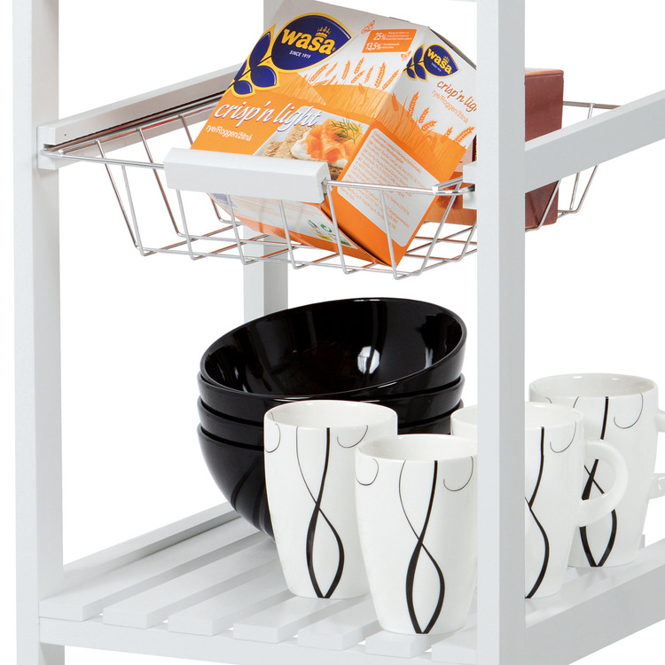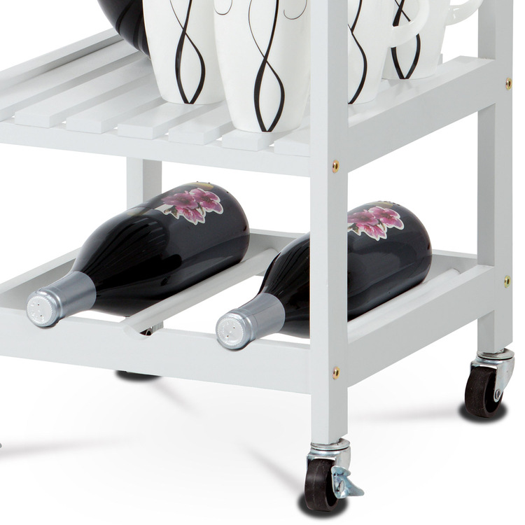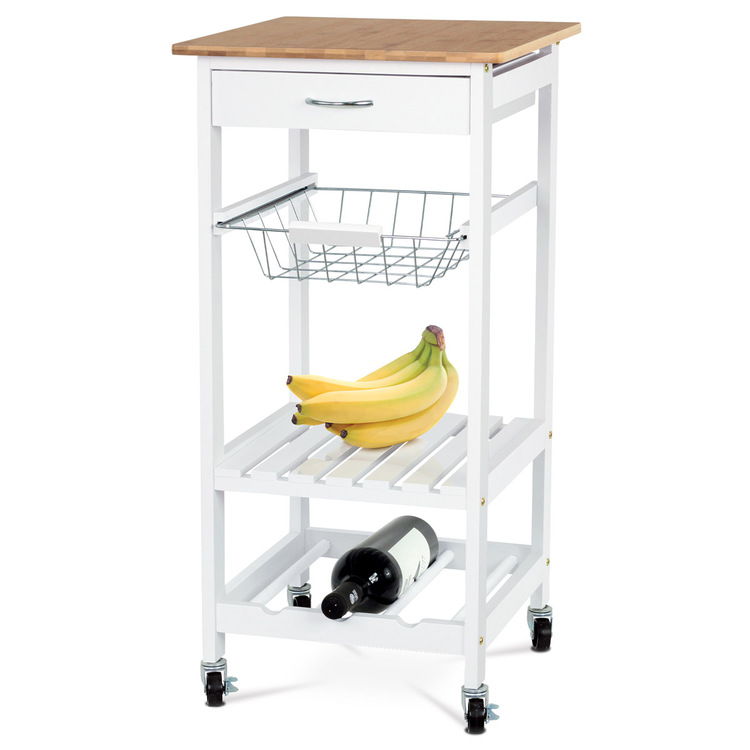 Bambusový regál na kolieskach s brzdami z MDF s úložným kovovým košíkom s chrómovou úpravou a dreveným zásuvkou, bude praktickým a elegantným doplnkom Vašej domácnosti. Regál je lakovaný matnou bielou farbou. Súčasťou regálu je tiež pevná odkladacia polička a pevne primontovaný stojan na víno, na ktorý si môžete odložiť až tri fľaše.