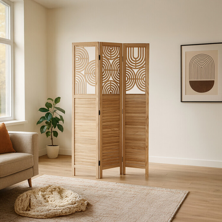 Trojdielny drevený paraván z masívu smreka v prírodnom odtieni kombinuje pevné prevedenie s dekoratívnou perforáciou hornej časti, ktorá vytvára zaujímavý vizuálny efekt. Každá časť je spojená kovovými pántami umožňujúcimi flexibilné nastavenie uhla a ľahké prenášanie či skladovanie. Paraván slúži ako praktický prvok na rozdelenie priestoru alebo zvýšenie súkromia v interiéri, pričom prírodný drevený dekor prináša do miestnosti teplý a prirodzený vzhľad. Povrch je upravený tak, aby materiál bol ľahko udržovateľný a odolný voči bežnému opotrebovaniu. Rozmery a konštrukcia zaisťujú stabilitu a dlhú životnosť produktu.