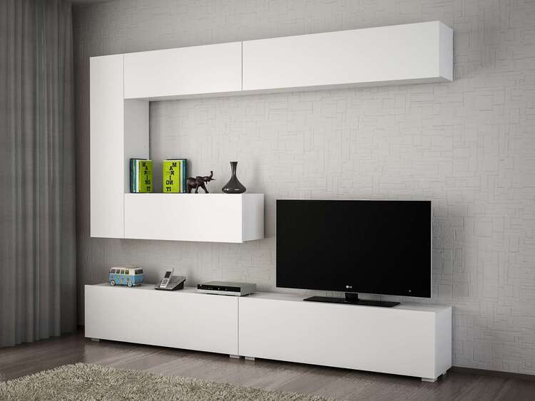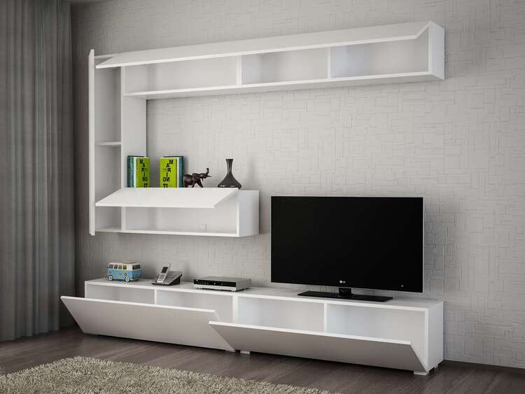 Predstavujeme obývaciu stenu, ktorá prináša do vašej obývačky moderný a elegantný dizajn. Táto široká a priestranná zostava v bielej farbe je navrhnutá tak, aby poskytovala praktické a estetické riešenie pre vaše multimediálne zariadenia a ďalšie potreby.