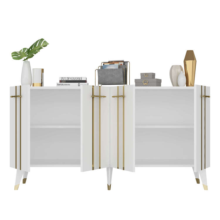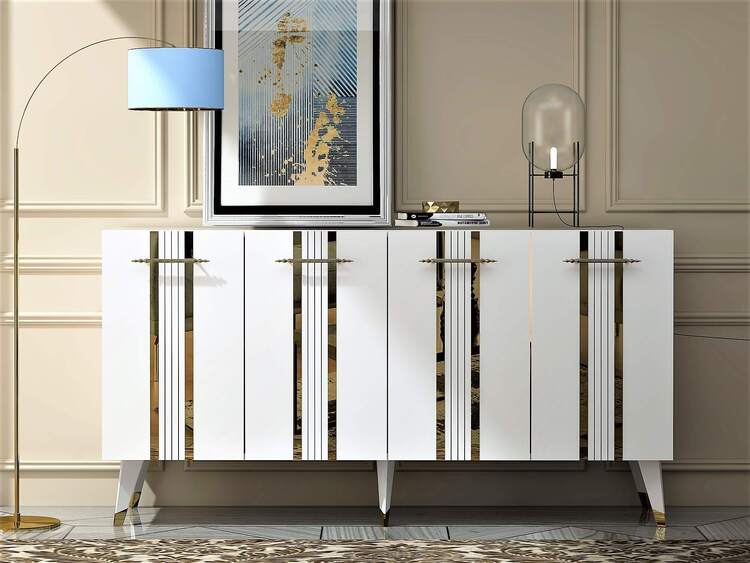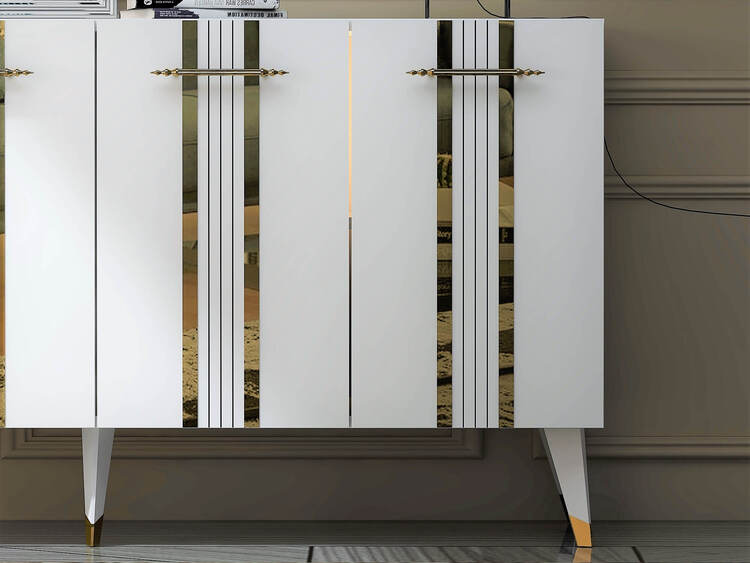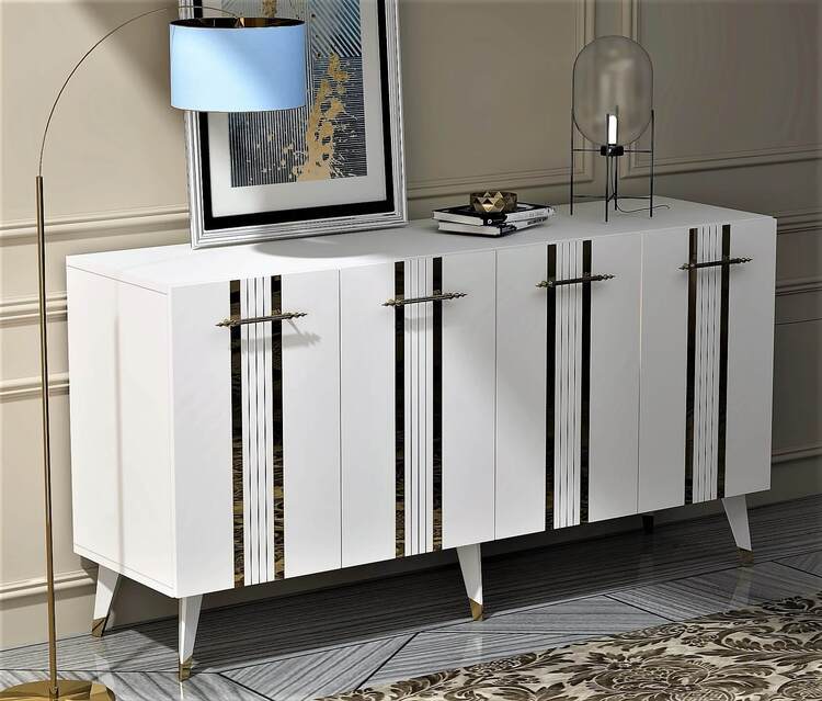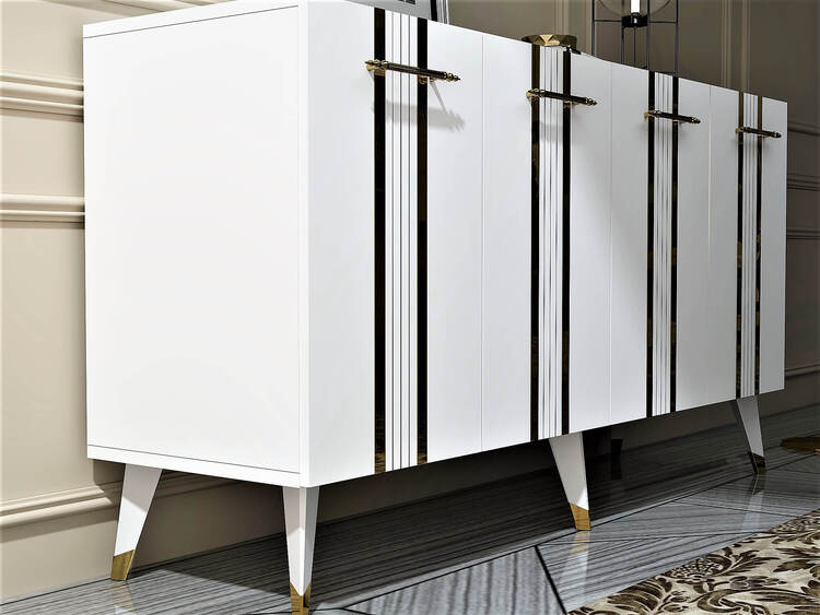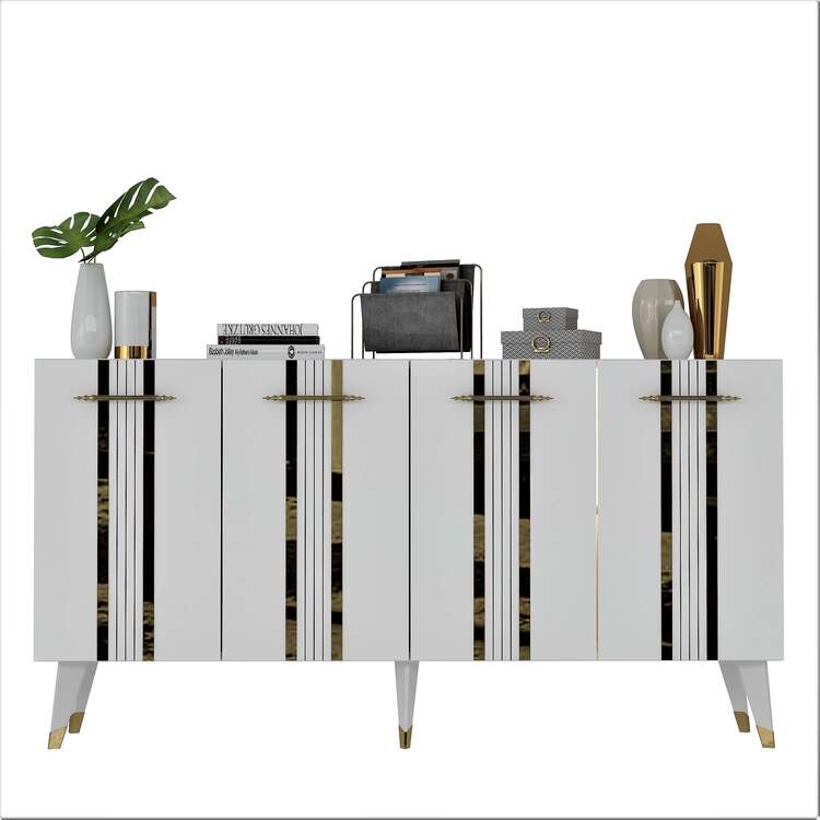 Skrinka prináša do vašej obývačky kombináciu luxusu a funkčnosti. Jej široký dizajn a elegantné spojenie antracitovej a zlatej farby dodáva interiéru sofistikovaný vzhľad. So štyrmi plnými dvierkami poskytuje dostatok priestoru na usporiadanie vašich vecí, či už ide o knihy, dekorácie alebo iné predmety.