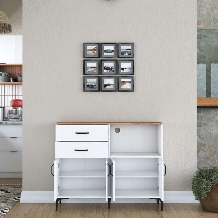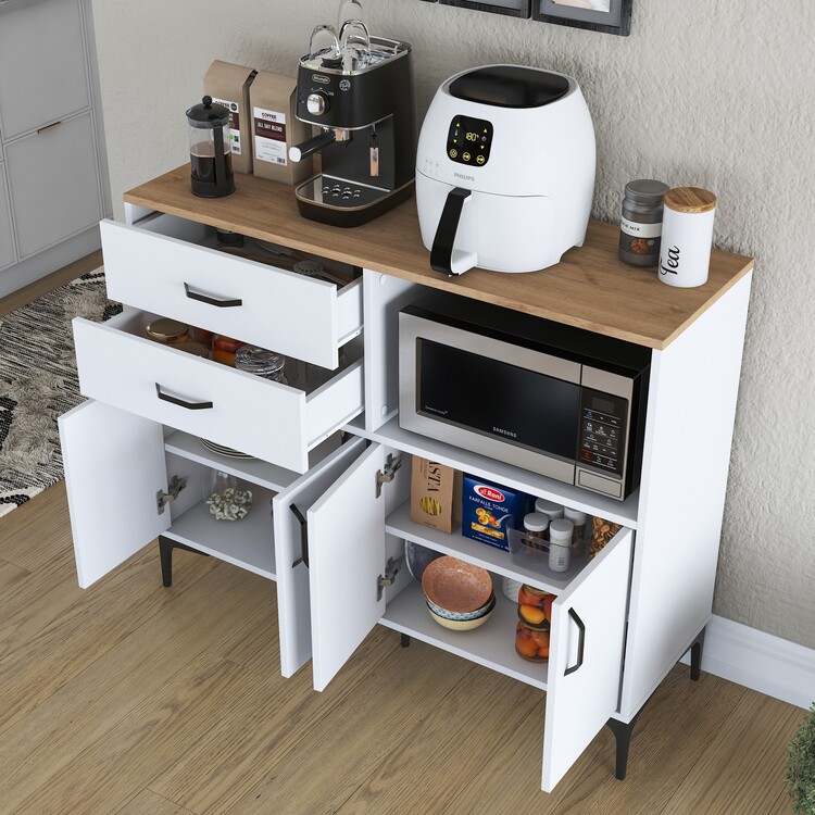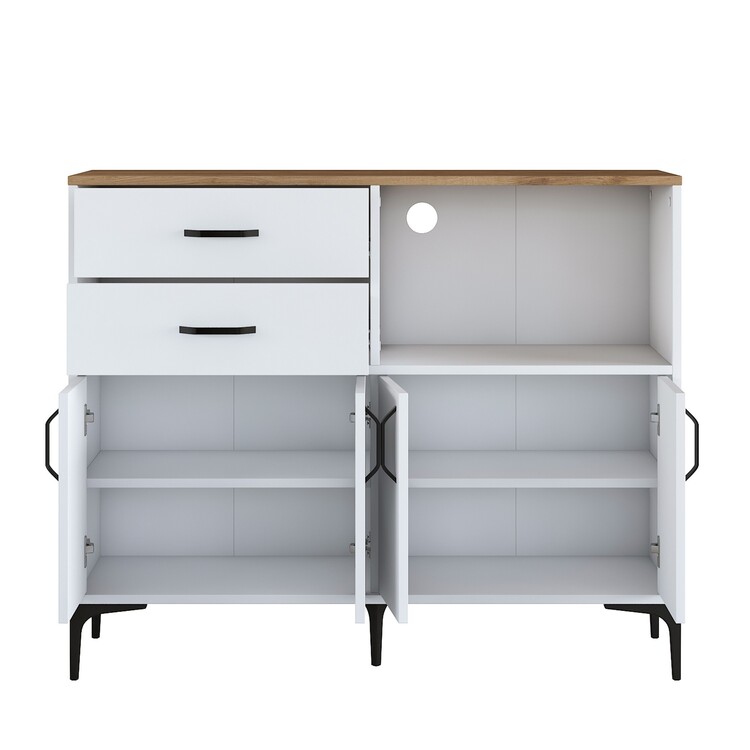 Kuchynská skrinka ponúka kombináciu úložných priestorov v podobe štyroch plných dvierok , dvoch zásuviek a praktického regálku. Horná časť je navrhnutá tak, aby pohodlne pojala mikrovlnnú rúru alebo ďalšie kuchynské spotrebiče. Skrinka je viacúčelová, čo znamená, že sa ľahko prispôsobí vašim potrebám.