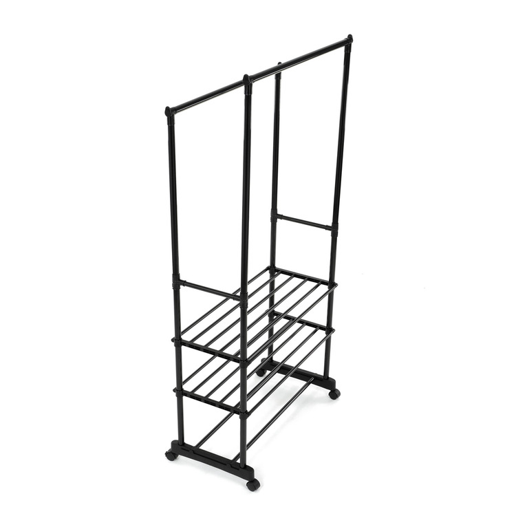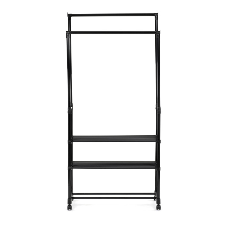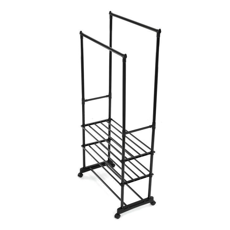 GD-166 BK - Stojan na šaty dvojramenný s tromi policami, čierna farba, kov / plast, chróm