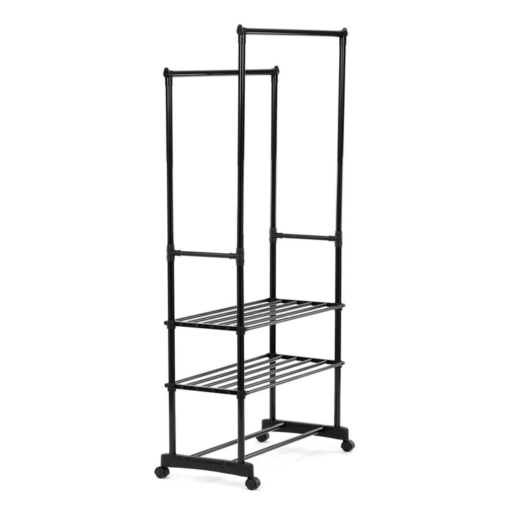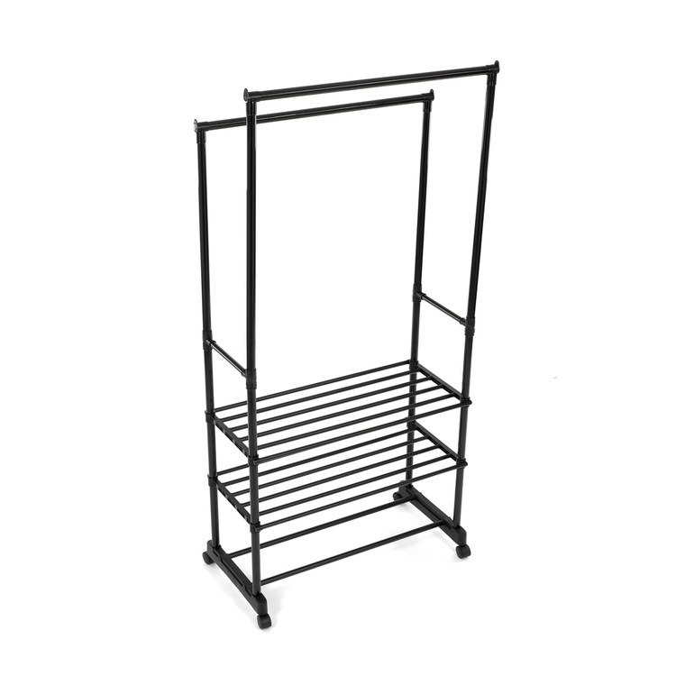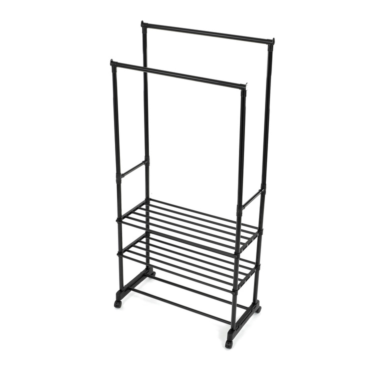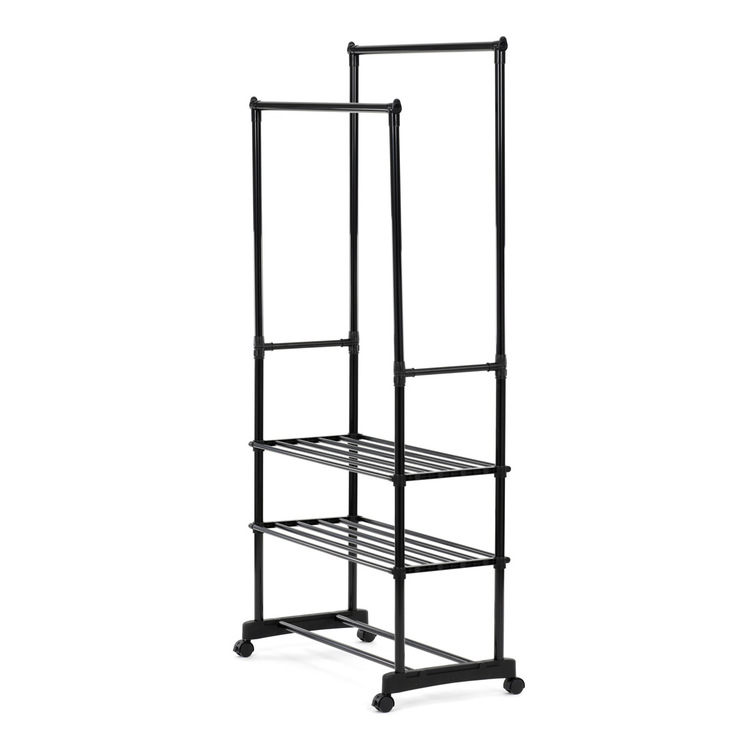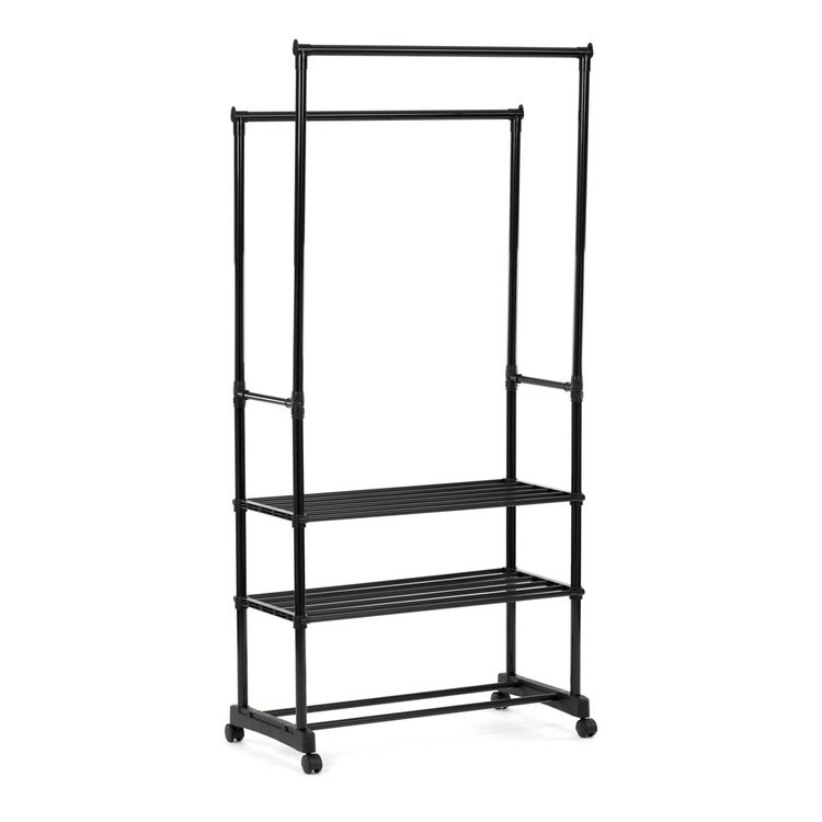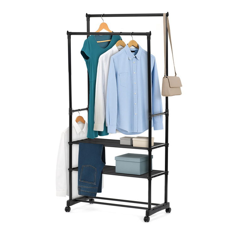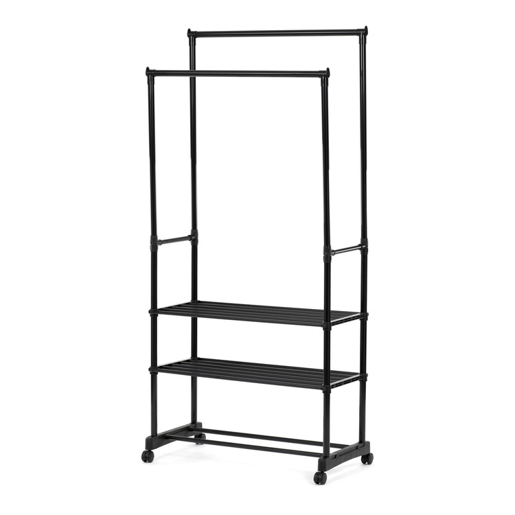 Priestranný stojan na šaty značky Autronic je ideálnym pomocníkom pre organizáciu vášho oblečenia. Robustná čierna kovová konštrukcia poskytuje stabilitu a moderný vzhľad, zatiaľ čo dve tyče na zavesenie ponúkajú dostatok priestoru na odevy. Tri spodné police sú perfektné na uloženie topánok, krabíc alebo doplnkov. Stojan je vybavený kolieskami pre ľahkú manipuláciu a flexibilitu pri umiestnení. Praktický a štýlový dizajn z neho robí skvelý doplnok do šatne, spálne alebo predsiene. Perfektná voľba pre prehľadnú a funkčnú organizáciu.