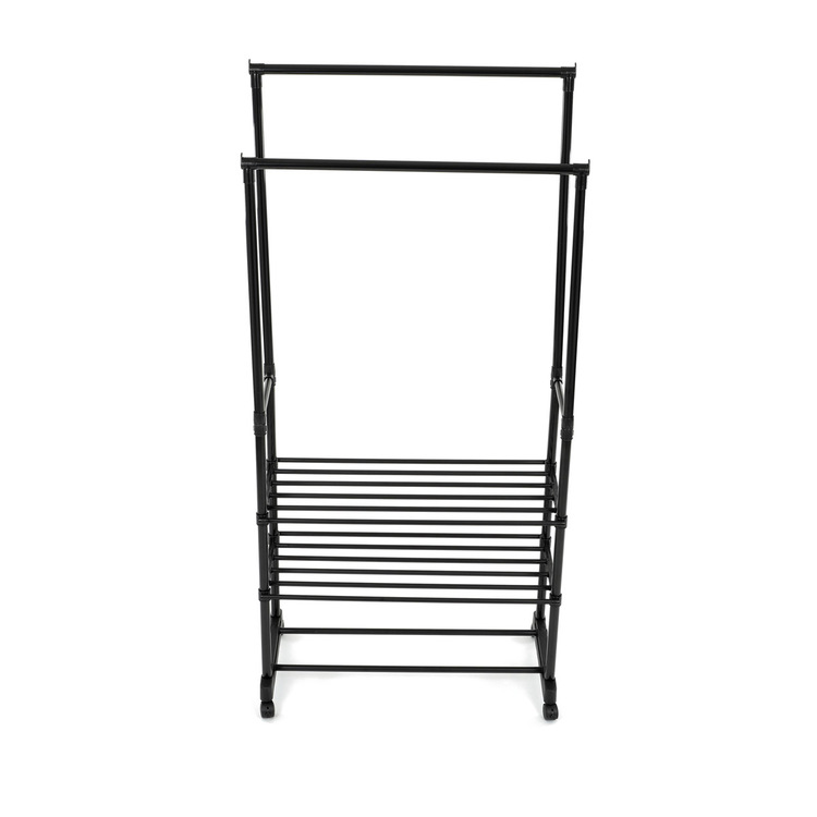 Priestranný stojan na šaty značky Autronic je ideálnym pomocníkom pre organizáciu vášho oblečenia. Robustná čierna kovová konštrukcia poskytuje stabilitu a moderný vzhľad, zatiaľ čo dve tyče na zavesenie ponúkajú dostatok priestoru na odevy. Tri spodné police sú perfektné na uloženie topánok,... více informací o zboží
