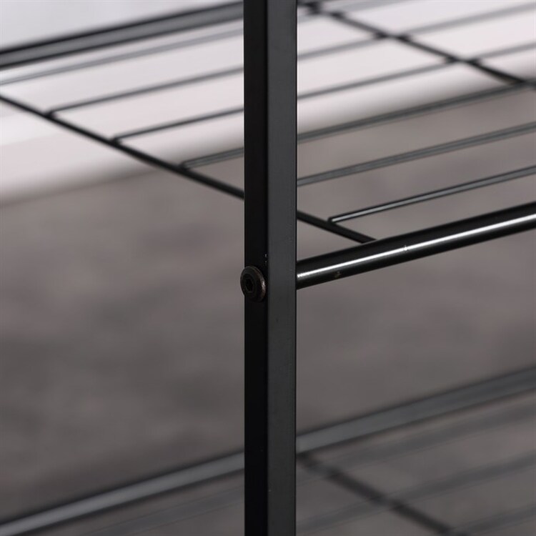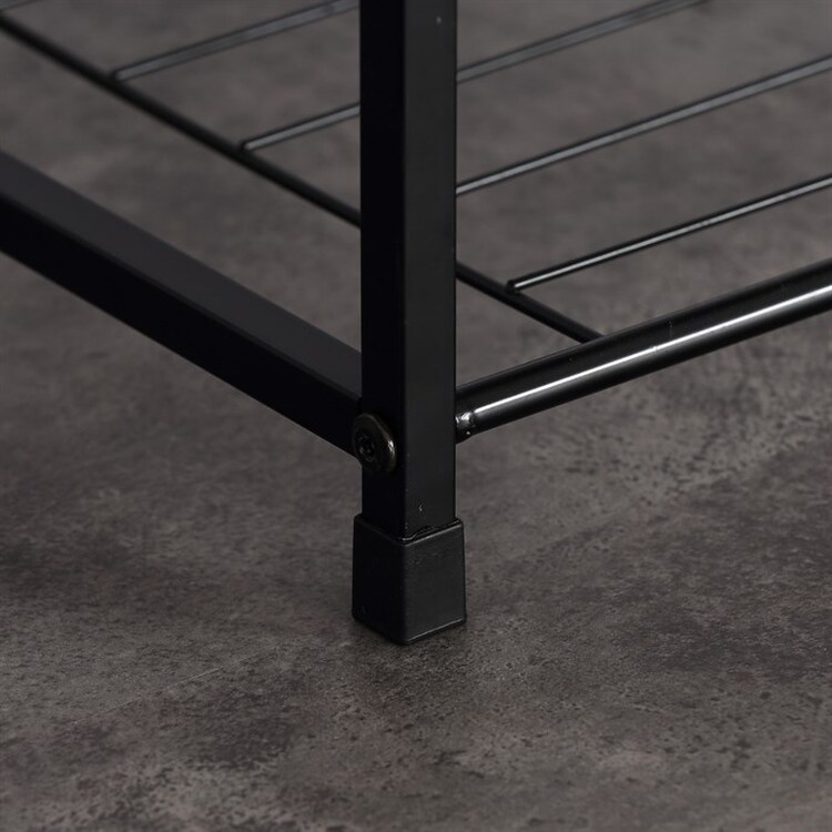 Botník s konštrukciou a odkladacími plochami z ľahkého kovu v čiernej farbe. Pôda je vyrobená z MDF dosky s povrchovou úpravou 3D fólie v odtieni dub sonoma.