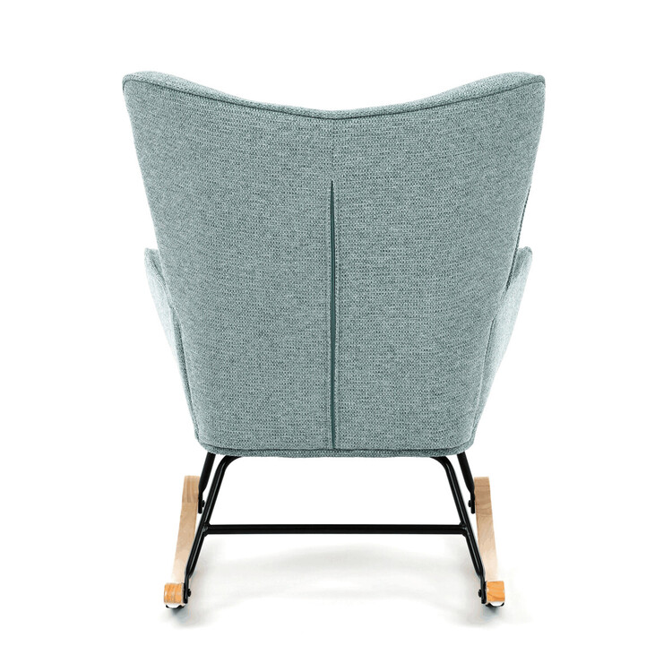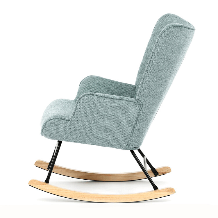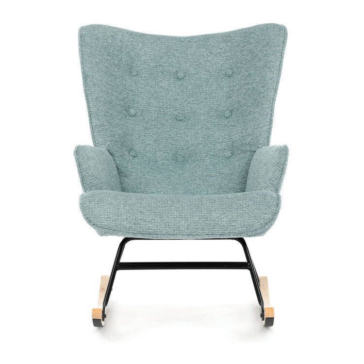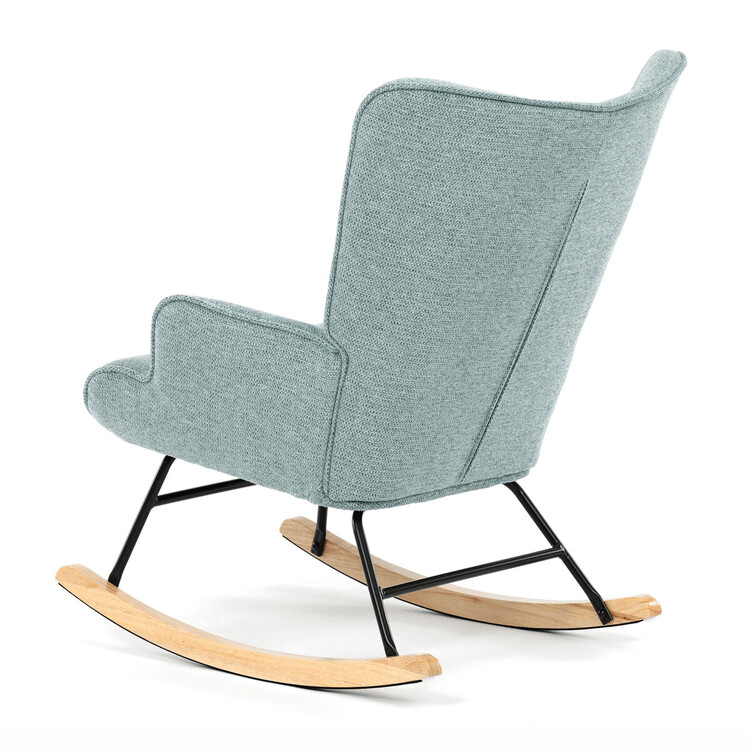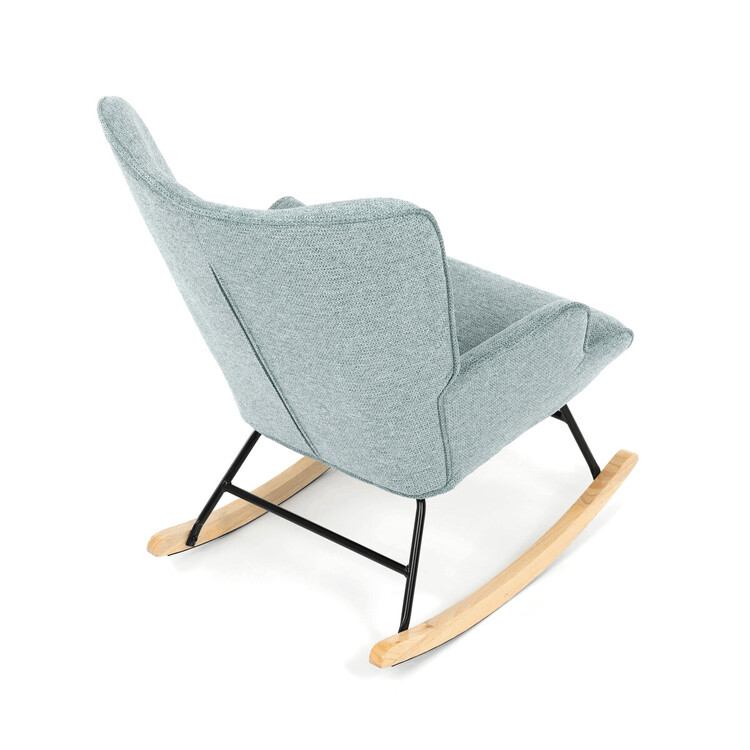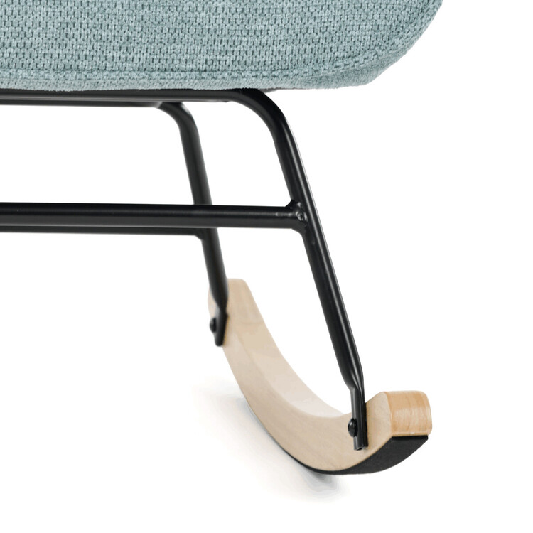 Hojdacie kreslo v modrom prevedení je potiahnuté prémiovou látkou, ktorá ponúka príjemný dotyk a jednoduchú údržbu. Sedák a operadlo sú ergonomicky tvarované pre pohodlné sedenie, doplnené o pevné čalúnené podrúčky. Stabilné nohy sú vyrobené z masívneho kaučukovníka a doplnené o čierny kovový rám, ktorý zaisťuje pevnosť a dlhú životnosť. Hojdací mechanizmus umožňuje plynulé hojdanie, ktoré prispieva k relaxácii a odpočinku. Kreslo je určené pre interiéry s dôrazom na komfort a štýl, jeho rozmery a nosnosť zodpovedajú bežným štandardom pre hojdacie kreslá.