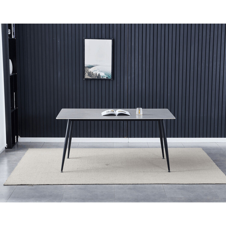 Moderný stôl 160x90x76 cm s doskou zo spekaného kameňa, imitujúci šedý matný mramor. Podnožie je kovové v práškovej čiernej farbe. Stolová doska je s nohami voľne spojená, pomocou plastových prísavných bodov