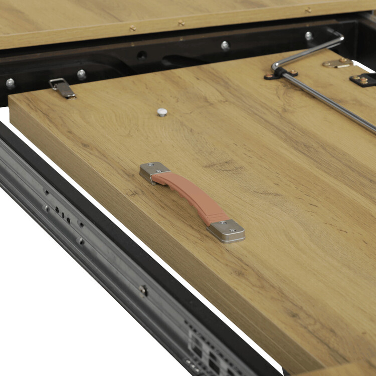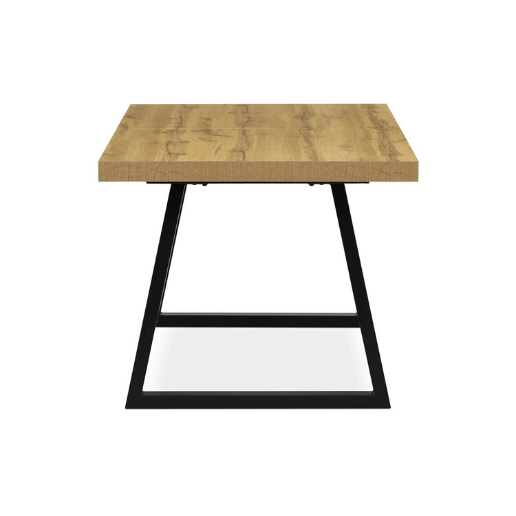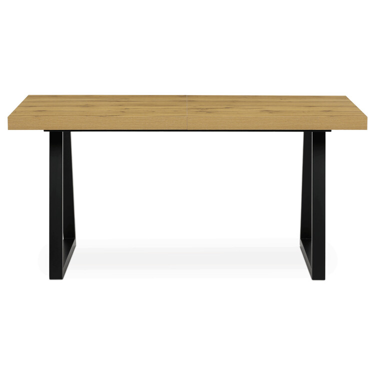 Jedálenský stôl s rozkladacou funkciou ponúka praktické riešenie pre flexibilné usporiadanie jedálenského priestoru. Doska stola je vyrobená z lamina s dubovým dekorom a matnou povrchovou úpravou, ktorá je odolná proti poškriabaniu a ľahko sa udržuje. Hrany dosky sú opatrené ABS lištou, ktorá zvyšuje odolnosť proti poškodeniu a zároveň dodáva stolu precízny vzhľad. Stabilná kovová podnož v čiernej farbe zaisťuje pevnú oporu a stabilitu počas používania. Rozmery 160×90 cm je možné rozšíriť o 80 cm, čo umožňuje pohodlné usadenie väčšieho počtu osôb. Výška stola 76 cm zodpovedá štandardným ergonomickým parametrom pre jedálenský nábytok.
