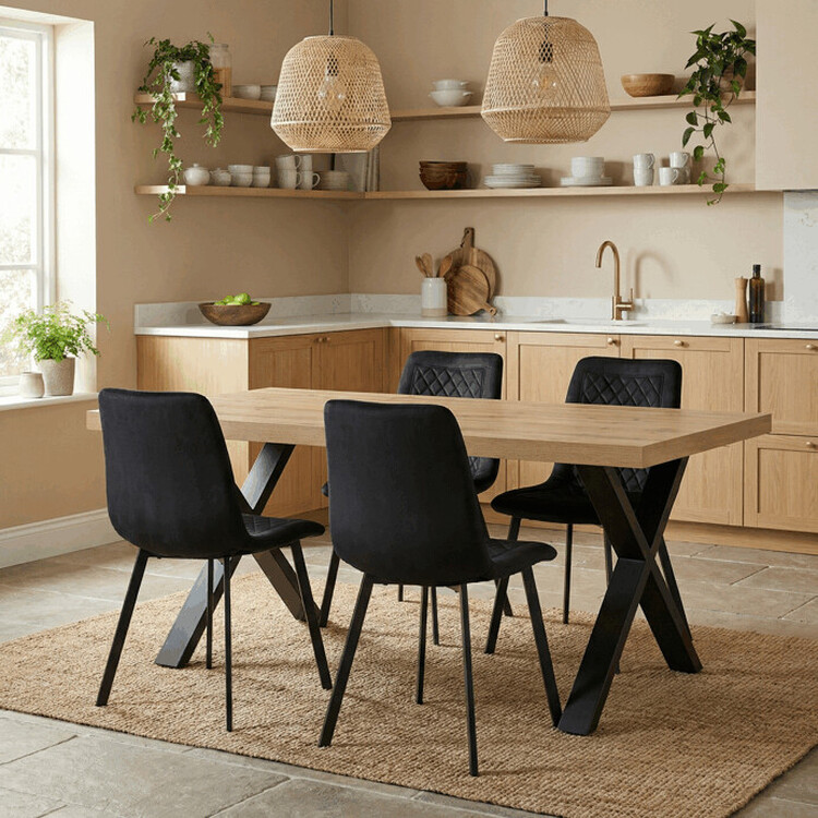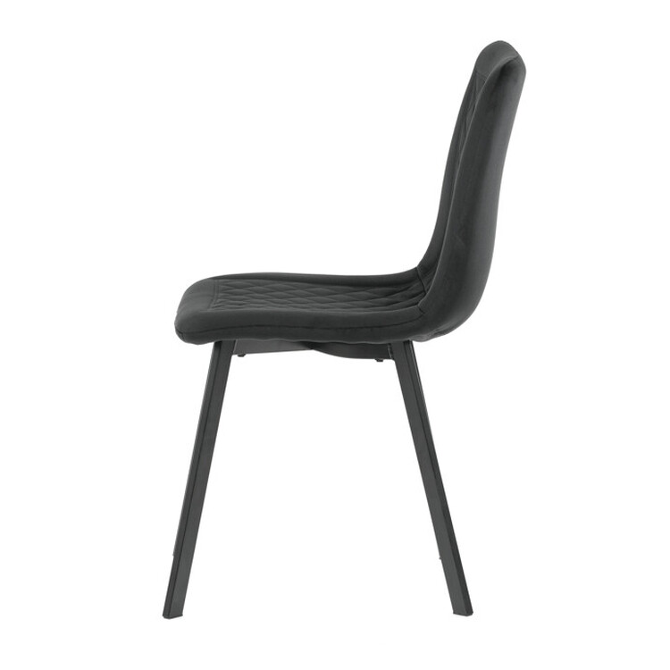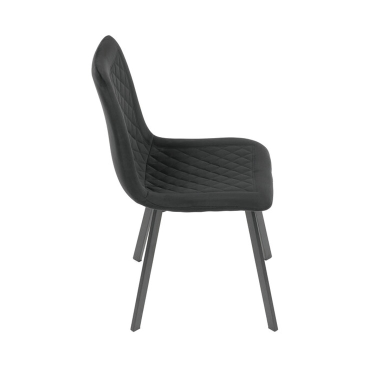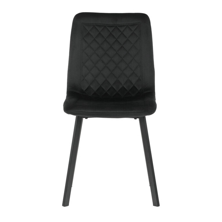Jedálenská stolička s čiernym zamatovým poťahom ponúka príjemný a mäkký povrch pre pohodlné posedenie. Sedák aj operadlo sú zdobené designovým prešitím, ktoré dodáva stoličke elegantný a moderný vzhľad. Stabilné kovové nohy v čiernej farbe zaisťujú pevnú oporu a dlhú životnosť. Stolička nemá podrúčky, čo umožňuje ľahké zasunutie pod stôl a úsporu miesta. Je vhodná do jedálenských priestorov aj moderne zariadených interiérov.