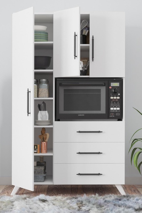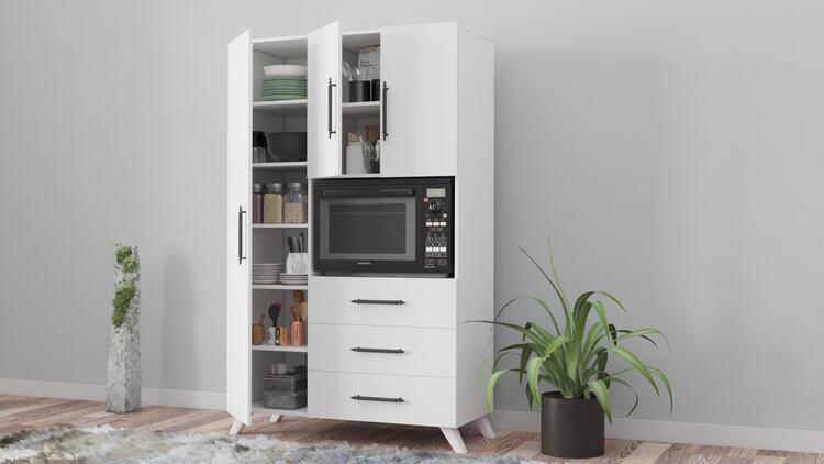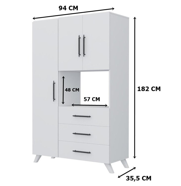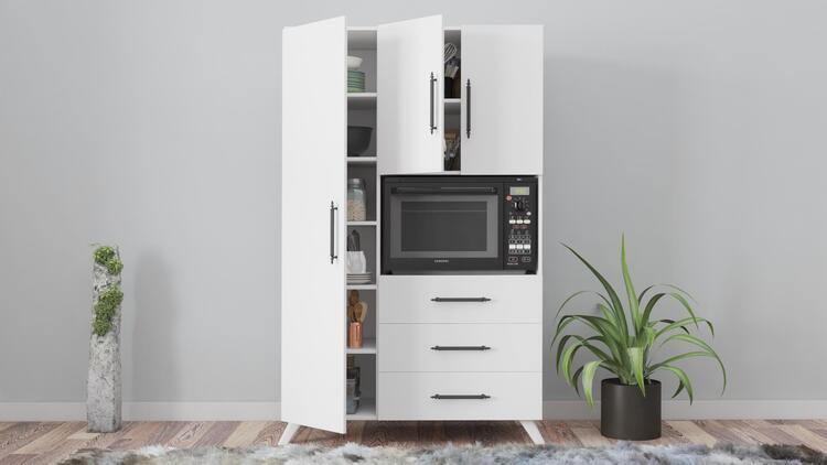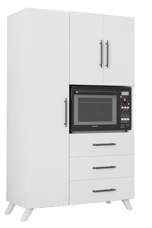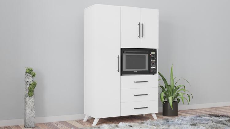Skriňa ADELINE disponuje 3 dvierkami, 3 šuplíky a špeciálnym priestorom pre mikrovlnku, čo zvyšuje jej praktickosť. Tiež disponuje 5 priestrannými poličkami. Stojí na elegantných nôžkach, čo uľahčuje údržbu podlahy pod ňou. Vyrobená z kvalitnej drevotriesky potiahnutej melamínom, multifunkčná skriňa ADELINE zaručuje dlhú životnosť a jednoduchú údržbu.