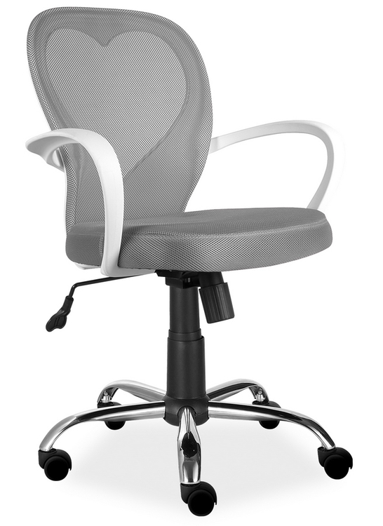 Moderné otáčací kancelárske kreslo s možnosťou nastavenia výšky sedadla. Kreslo je v romantickom štýle a tak isto poteší každú detskú dušu. Podstavec je z kovu, čalúnenie je z membránové látky v šedej farbe. Výška sedadla je v rozmedzí 45 - 55 cm, celková výška je 88 - 98 cm. Dodávame v demontovanom stave.