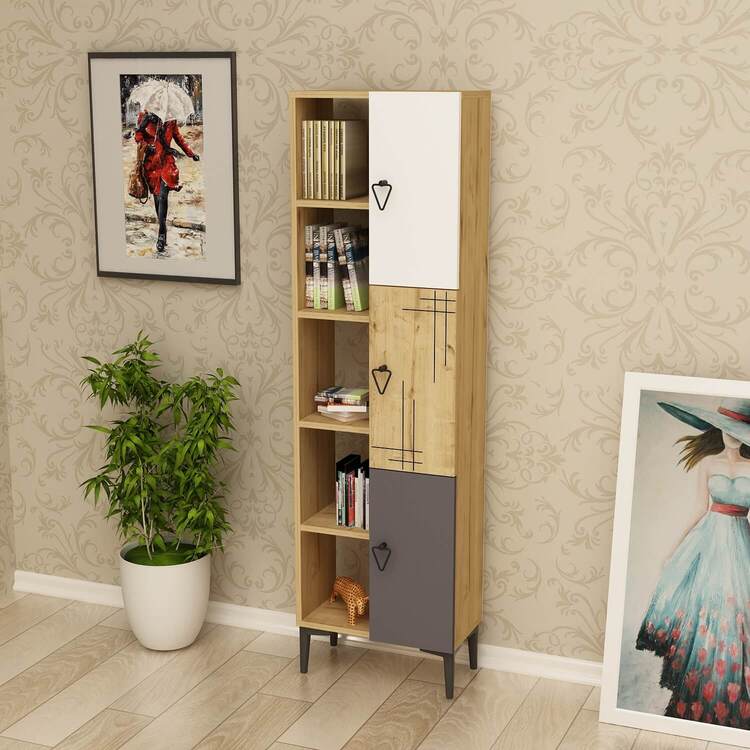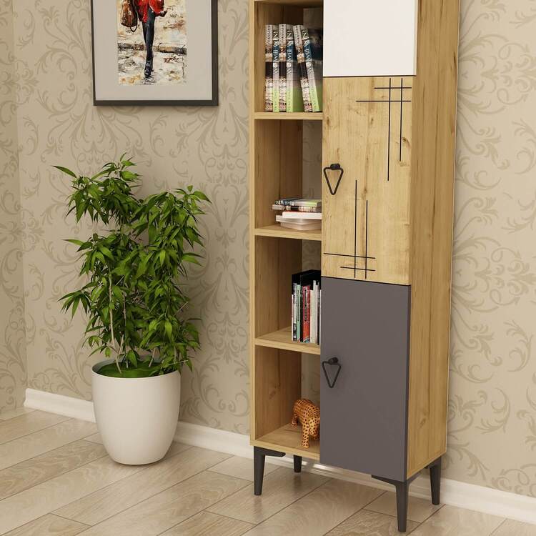 Knižnica je dokonalým spojením funkčnosti a moderného designu. Je ideálny pre obývaciu izbu, kde ponúkne dostatok úložného priestoru vďaka trom plným dvierkam a štyrom policam. Jej kombinácia farieb a čisté línie dodajú vášmu interiéru elegantný a moderný vzhľad.