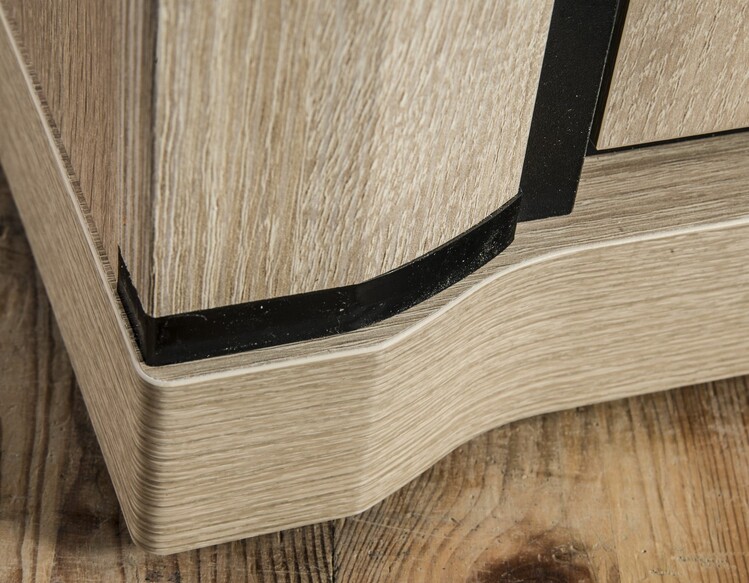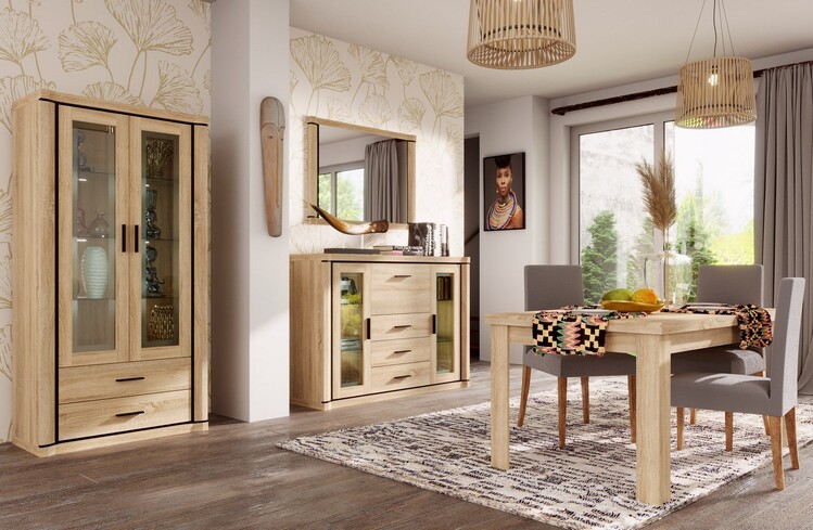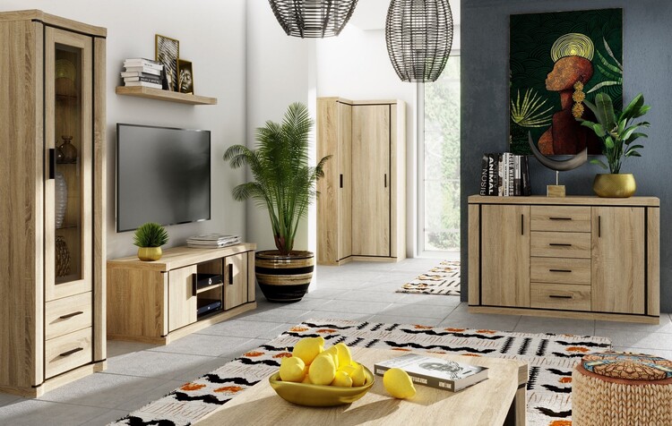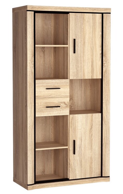 Kombinovaný regál zo sektorového radu, ktorý má dve zásuvky, dvoje dvierka a poličky. Má zaujímavé prevedenie v podobe netradične vyrezávaných vrchných a spodných dosiek. Systém je exkluzívna kolekcia navrhnutá v modernom duchu. Celý rad sa vyznačuje masívnym vzhľadom a jednoduchými tvarmi. Nábytok je vyrobený z kvalitného LTD s lištami z MDF, súčasťou nábytku sú dosky 48 mm, všetko opatrené ABS páskou. Farebné prevedenie - dub sonoma. Má široký výber komponentov, vďaka ktorým je možné vybaviť nielen obývaciu izbu, ale aj jedáleň alebo kanceláriu. Možnosť dokúpenia 3 políc. Dodávame v demontovanom stave.CASA 71003