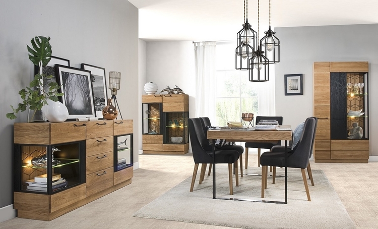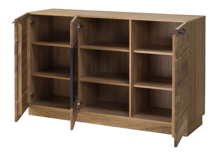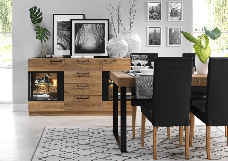 Komoda t? Ídve? Ová zo sektorovej? Obrady MOSAIC. Moderné prevedenie masívneho leští? Ného duba dodá jedine? Ný vzhľad vašej jedáleÅ? alebo obývacej izbe. Povrch vn? Jších? Astí je ošetrovate? En olejom - dub medový alebo lakovaný -? Ierny mat. Korpus je doplnené? Nz vn? Nejšie strany p? Prírodné dyhou, vnútro? Nej strana je vyrobená z dosky LTD vo farbe? p prírodného d? eva. Dvoje? Ka sú vyrobené z leští? Ného masívneho dubu. Úchyty sú kovové? Ierne. Dodávame už v zmontovanom stave.