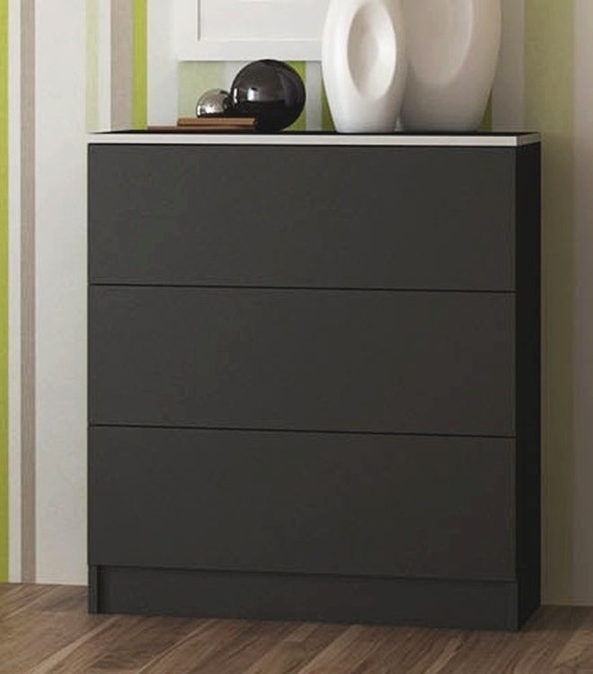 Komoda s 3 zásuvkami z kolekcie VISTA v modernom prevedení. Korpus aj dvoje? Ka sú z kvalitného LTD vo farbe? ? Ierne mat, komoda obsahuje elegantné lišty vo farbe? aluminium. Dodávame v demontovanom stave.