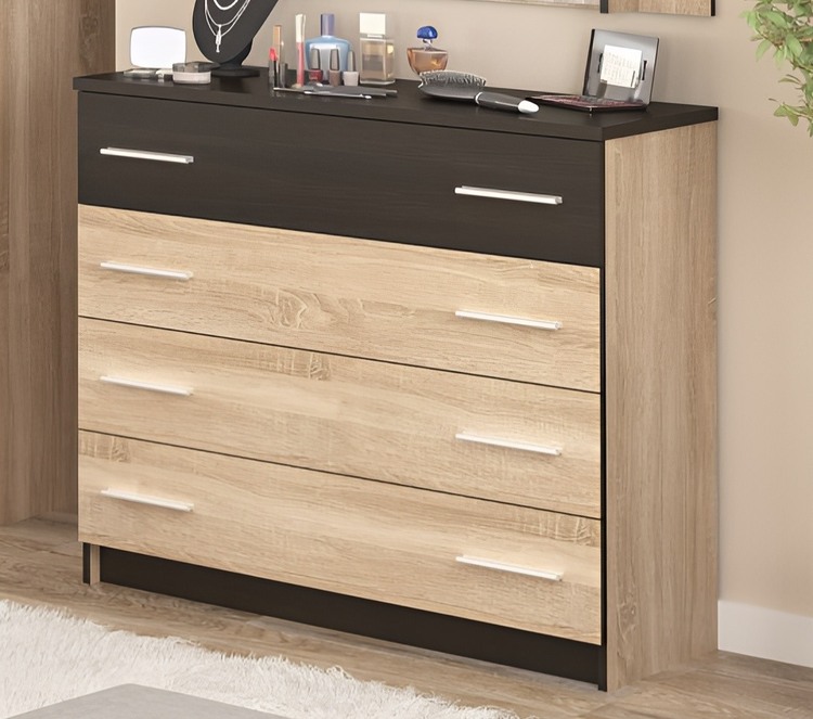 Komoda so 4 zásuvkami zo spálňového radu. Moderné prevedenie v kontrastných farbách dokonale doplní váš interiér. Komoda je vyrobená z kvalitnej LTD dosky vo farebnej kombinácii dub sonoma/wenge. Ponuka komponentov tohto sektorového radu umožňuje zostaviť si nábytok do spálne alebo študentskej izby podľa vlastných predstáv. Dodávame v demontovanom stave.CASA 97003