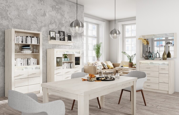 Komoda zo sektorovej? Obrady INDIANAPOLIS. Komoda má na ľavej strane? 4 zásuvky, na pravej je jedna cz? Í? Ka za dvoje? Ky sú 2 police. Systém INDIANAPOLIS je exkluzívna kolekcia navrhnutá v modernom duchu. Vsadením LED osv? Osvetlenie do ozdobnej ryhované lišty, ktoré nájdete v našej ďalšej ponuke na dokúpenie, je zvýrazní? N rustikálny vzhľad masívneho d? Eva. Celá? Ada sa vyzna? Uje eleganciou a jednoduchými tvarmi, ktoré zaru? Ujú plné využitie priestoru. Nábytok je vyrobený z kvalitného lamina s ABS hrany (0,5-0,8 mm). Farebné prevedenie jaseň biely. Dodávame v demontovanom stave.