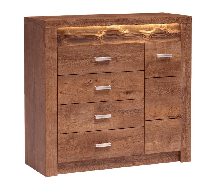 Komoda zo sektorovej? Obrady INDIANAPOLIS. Komoda má na ľavej strane? 4 zásuvky, na pravej je jedna cz? Í? Ka za dvoje? Ky sú 2 police. Systém INDIANAPOLIS je exkluzívna kolekcia navrhnutá v modernom duchu. Vsadením LED osv? Osvetlenie do ozdobnej ryhované lišty, ktoré nájdete v našej ďalšej ponuke na dokúpenie, je zvýrazní? N rustikálny vzhľad masívneho d? Eva. Celá? Ada sa vyzna? Uje eleganciou a jednoduchými tvarmi, ktoré zaru? Ujú plné využitie priestoru. Nábytok je vyrobený z kvalitného lamina s ABS hrany (0,5-0,8 mm). Farebné prevedenie jaseň sv? Svetlami. Dodávame v demontovanom stave.