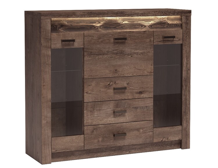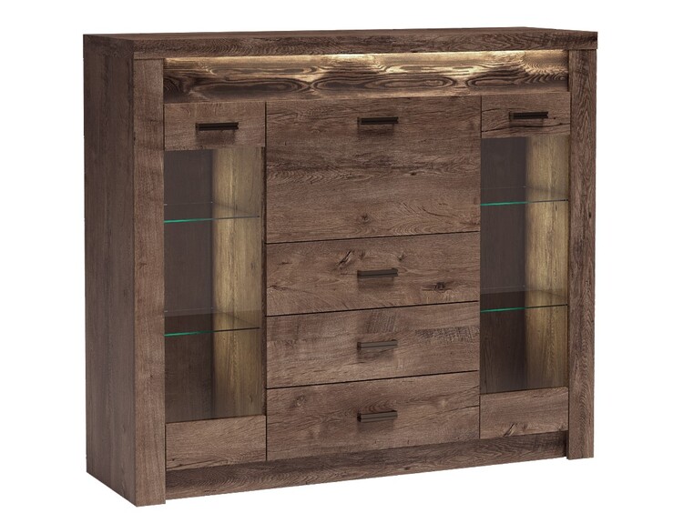 Komoda - bar zo sektorové? Obrady INDIANAPOLIS. Komoda obsahuje 2 vitríny, 3 zásuvky a výklopná dvoje? Ka. Systém INDIANAPOLIS je exkluzívna kolekcia navrhnutá v modernom duchu. Vsadením LED osv? Osvetlenie do ozdobnej ryhované lišty, ktoré nájdete v našej ďalšej ponuke na dokúpenie, je zvýrazní? N rustikálny vzhľad masívneho d? Eva. Celá? Ada sa vyzna? Uje eleganciou a jednoduchými tvarmi, ktoré zaru? Ujú plné využitie priestoru. Nábytok je vyrobený z kvalitného lamina s ABS hrany (0,5-0,8 mm). Farebné prevedenie jaseň tmavý. Dodávame v demontovanom stave.