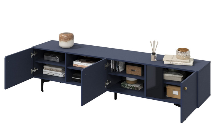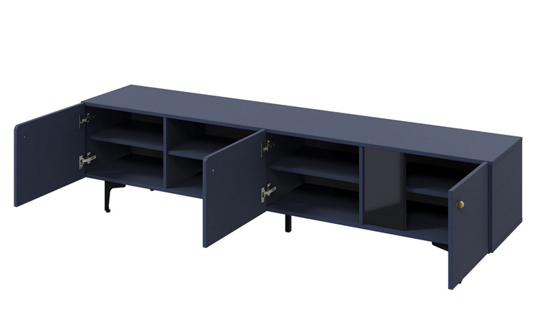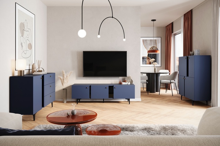 Komoda trojdverová vhodná ako televízny stolík. Dvierka majú soft close - systém tichého dovierania. Kolekcia moderných komôd je určená pre tých, ktorí milujú farebné priestory, ale aj pre tých, ktorí dávajú prednosť vneseniu farby do interiéru pomocou jedného výrazného prvku. Nie je žiadnym tajomstvom, že farba v interiéri zohráva obrovskú, takmer kľúčovú úlohu. Jej výber ovplyvňuje nielen celkový vzhľad miestnosti, ale predovšetkým našu náladu. Rozmery viď obrázok. Farebné prevedenie – tmavo modrá granát, úchyty sú tvarované zlaté. Dodávame v demontovanom stave.