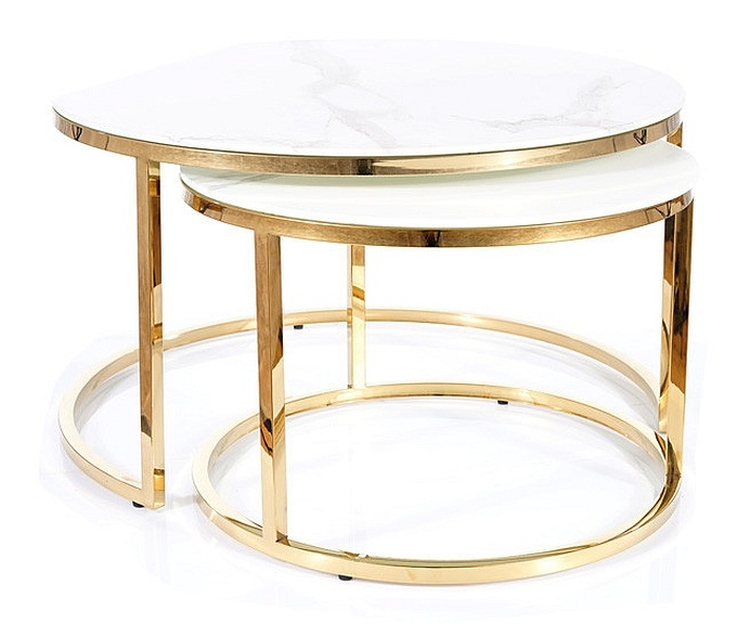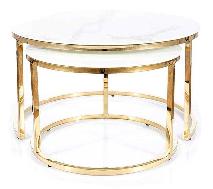 Súprava dvoch okrúhlych konferenčných stolíkov v modernom štýle glamour. Konštrukcia je z kovu v zlatej farbe, vrchná doska je z tvrdeného skla s efektom bieleho mramoru. Tento štýlový kúsok v netradičnom dizajne sa bude vynímať v každom interiéri. Dodávame v demontovanom stave. Rozmery väčšieho stolíka sú 80x80x45 cm, rozmery menšieho 60x60x40 cm.CASA 11891