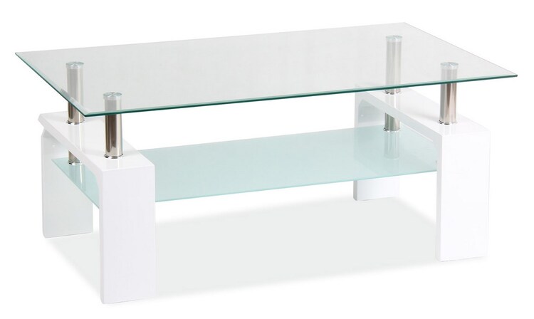 Štýlový konferen? Nej stolík v modernom prevedení. Konštrukcia MDF je vo farbe? biely lak v kombinácii s pochrómovaným kovom, vrchná doska (8 mm) pri stole je z pr? hledného skla, odkladacia poli? ka je z mlie? ného skla. Sklo je tvrdené. Tento stolík je možné objednať aj v inom prevedení materiáli a farieb.