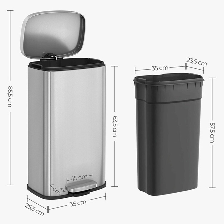 Odpadkový kôš s objemom 30 litrov je vyrobený z nerezového kovu v elegantnom striebornom prevedení, ktoré ľahko zapadne do moderných aj klasických interiérov. Praktický pedál umožňuje hygienické otváranie veka bez použitia rúk, čo zvyšuje komfort a čistotu pri používaní. Kôš má stabilnú základňu s protišmykovou úpravou, ktorá zaisťuje pevné postavenie na podlahe. Jeho hladký povrch sa ľahko udržuje a odoláva bežnému opotrebovaniu, čo prispieva k dlhej životnosti produktu.