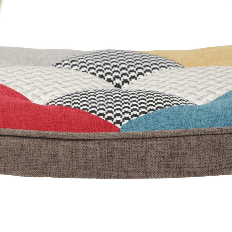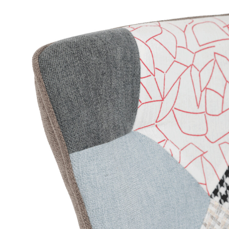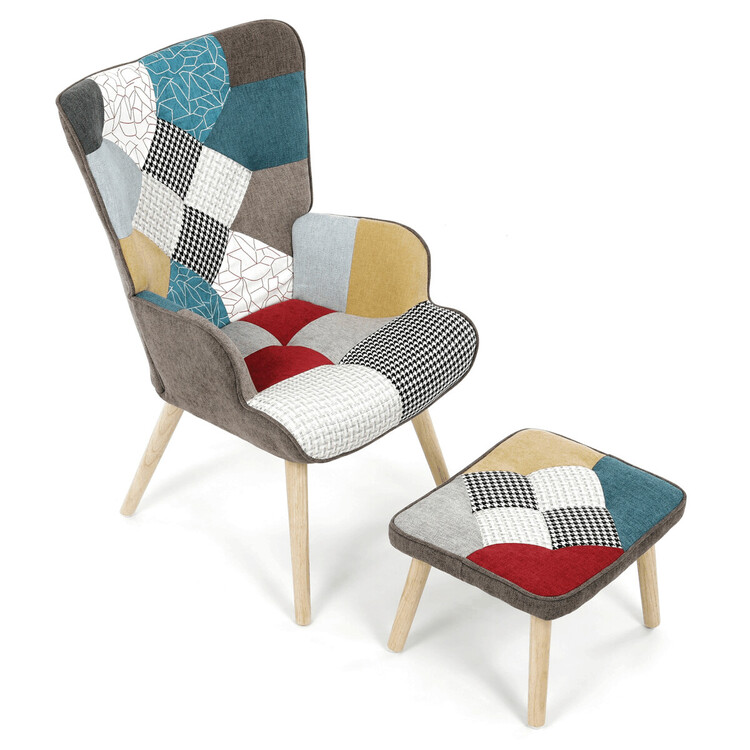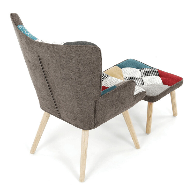 Relaxačné kreslo s podnožkou v patchworkovom dizajne kombinuje viacfarebnú látku s pevnými nohami z masívneho kaučukovníka, ktoré zaisťujú stabilitu a dlhú životnosť. Čalúnenie je tvorené kvalitnou látkou s rôznorodými vzormi, ktorá dodáva kreslu výrazný vizuálny efekt a zároveň príjemný povrch na sedenie. Kreslo je vybavené pevnými podrúčkami, ktoré podporujú pohodlný posed, a doplnené o samostatný taburet pre maximálnu relaxáciu nôh. Ergonomicky tvarované operadlo a sedadlo poskytujú komfortnú oporu pre odpočinok. Tento set je ideálnou voľbou pre interiéry, kde sa kladie dôraz na farebnosť a pohodlie.