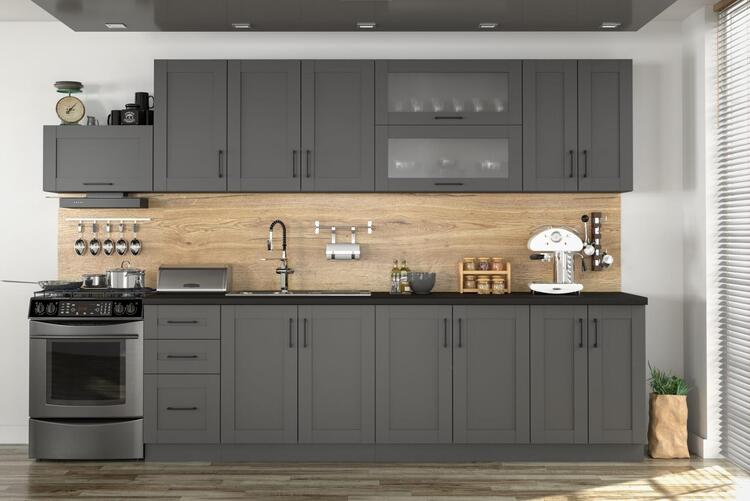 Kuchyňa vo farebnom prevedení antracit je vyrobená z dosky LTD. Kuchyňa je navrhnutá tak, že skrinky sa dajú poskladať v ľubovoľnom poradí. To vám umožní zostaviť si kuchyňu podľa svojich potrieb a predstáv. Úchyty sú kovové v čiernej farbe. Pracovná doska, spotrebiče, drez a digestor nie sú súčasťou kuchyne.